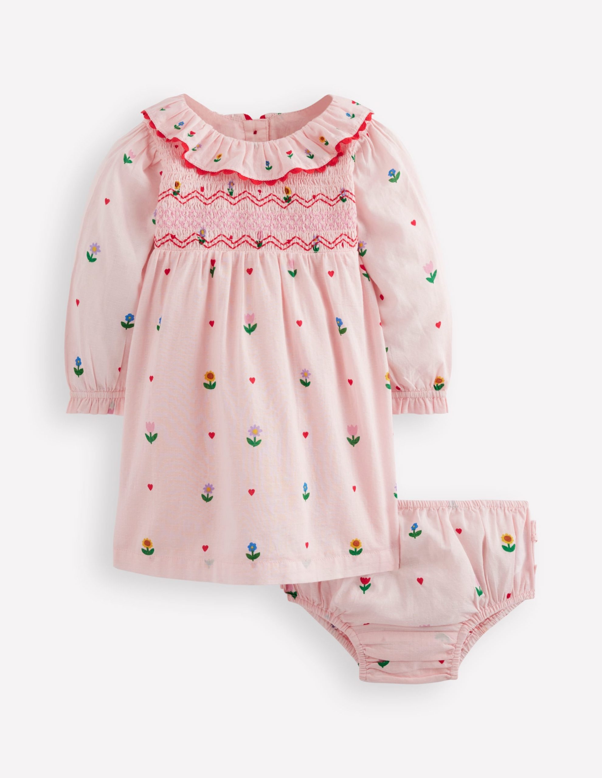 This special dress is full of aww-inspiring details, from the large ruffle collar to the embroidered smocking and frilly sleeves. There are matching pants, too.