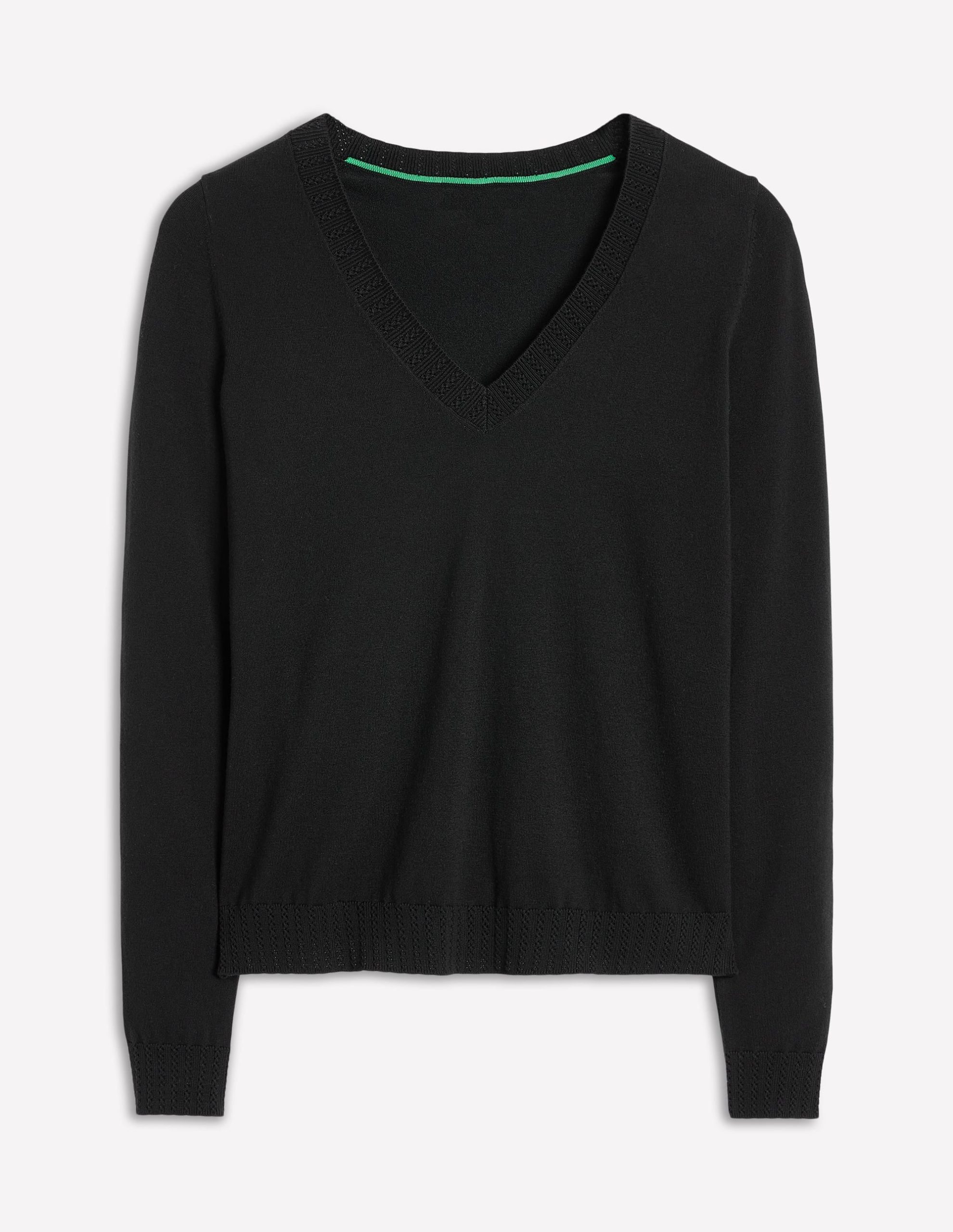 Introducing our Emilia V-neck jumper, complete with intricate knit detailing at the cuffs and neckline. Get one in every colour, we say…