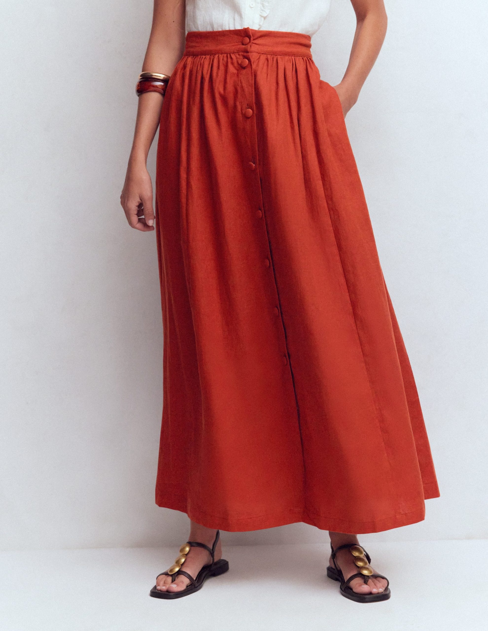 Expect this linen maxi skirt to feature in all your spring and summer plans. A lot. With its gentle gathers and fabric-covered buttons. it works with everything from a plain tee to a smarter blouse. Finish the look with a raffia bag.