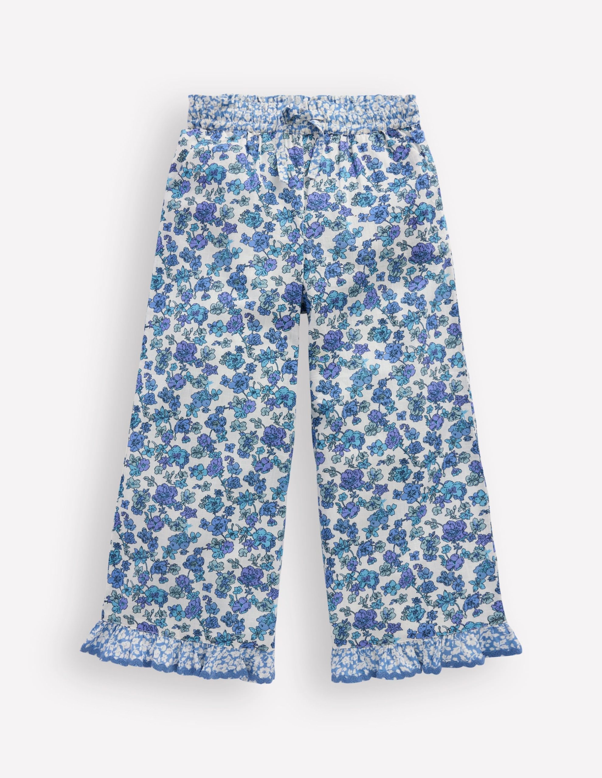How do we make Mini trousers so joyful With pretty prints and a frilly hem. This pair also has a stretchy drawstring waistband and flared legs made for high kicks. Oh. and there’s pockets.