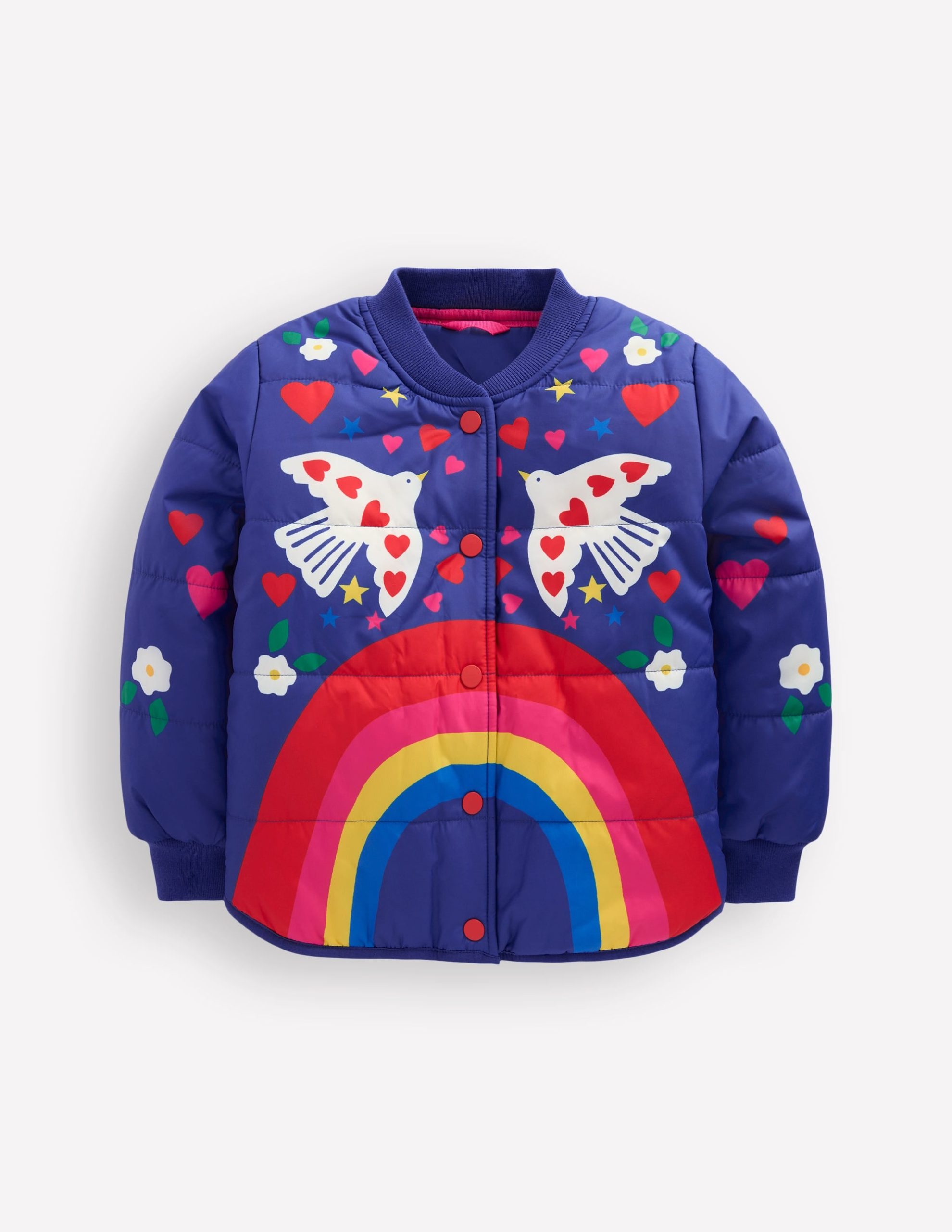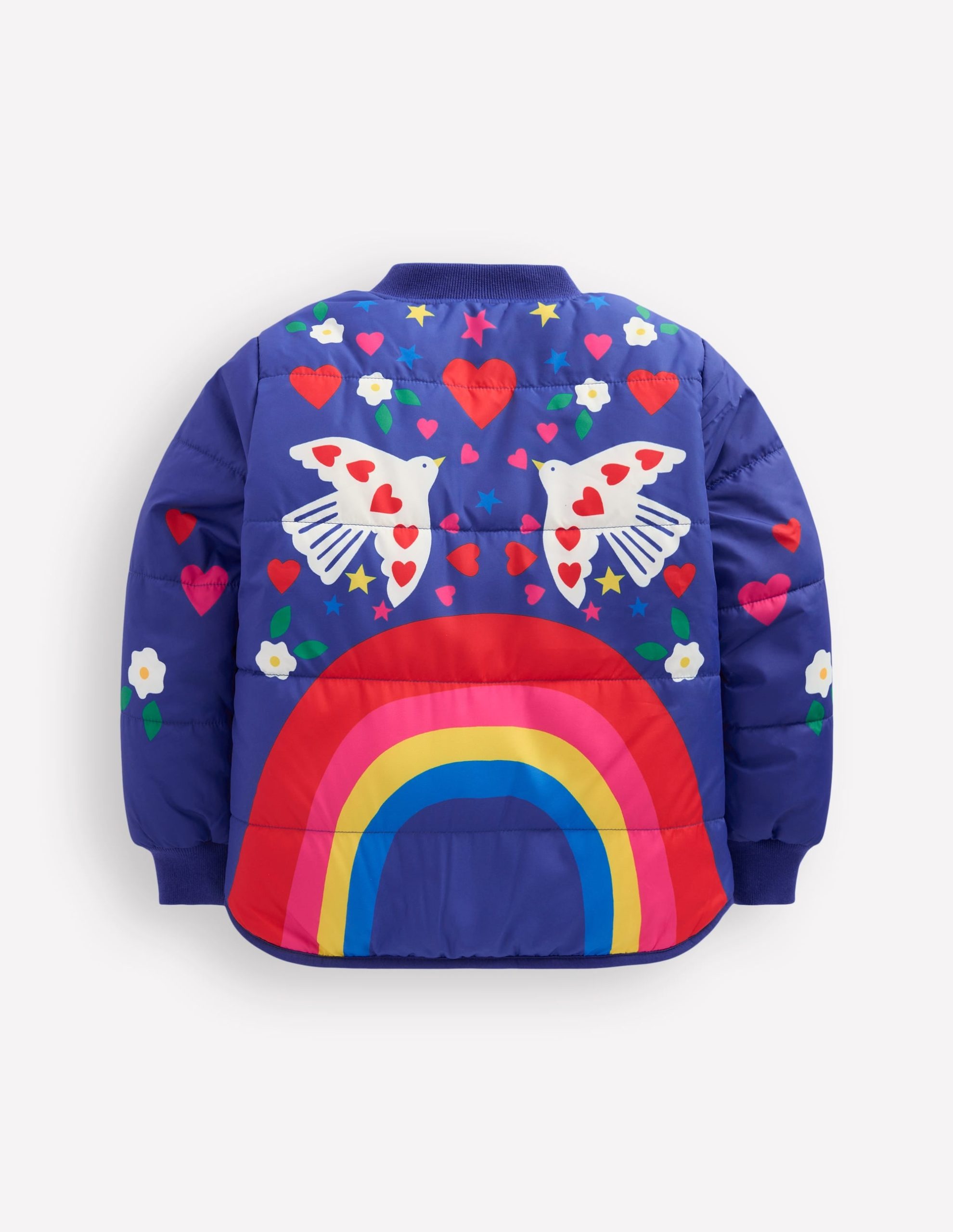 More than just a jacket, this invites Minis to let their personality shine. With a modern bomber style, this cosy layer has a soft sherpa lining and a choice of playful prints, from florals to rainbows and metallics.