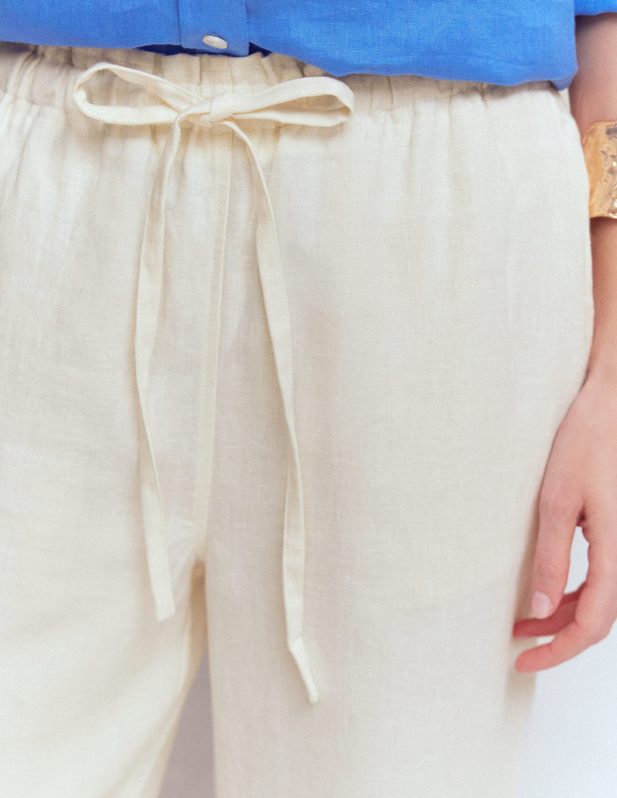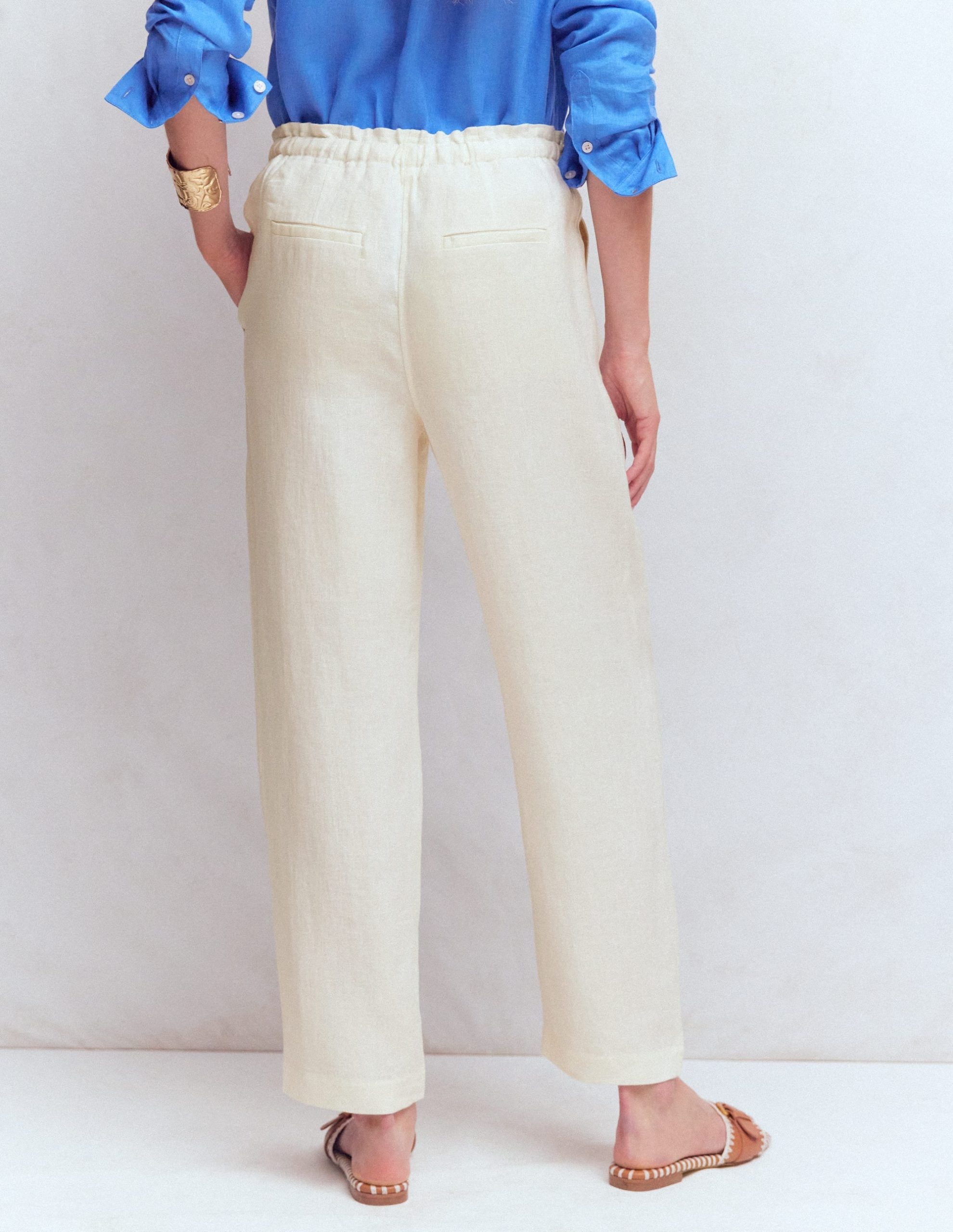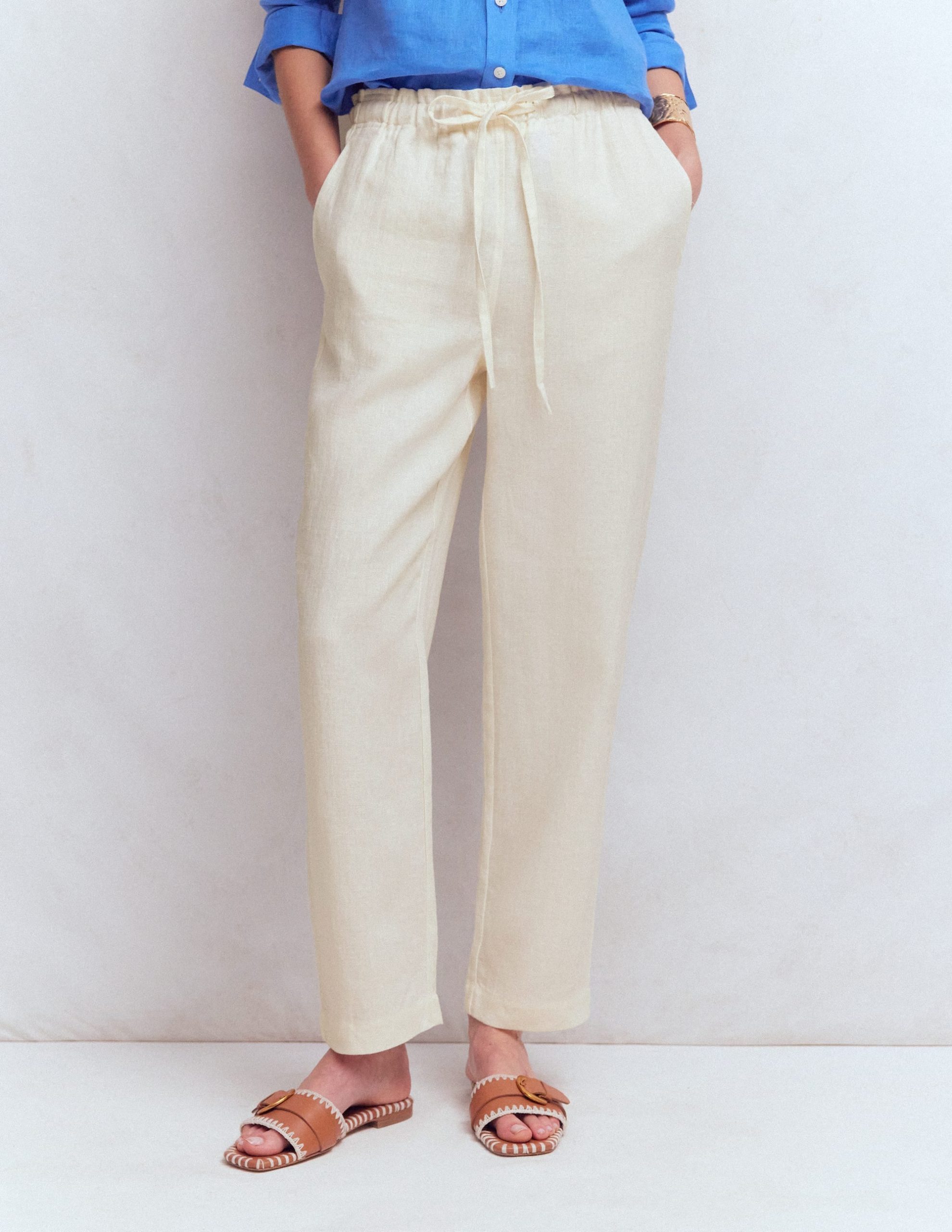 We strive to boost your mood and make your life easier. These cropped trousers will deliver on both. The drawstring waist and breezy pure linen fabric will keep you feeling cool and comfortable whatever the day throws at you. Pull them on. add a vest and a mega-watt smile.