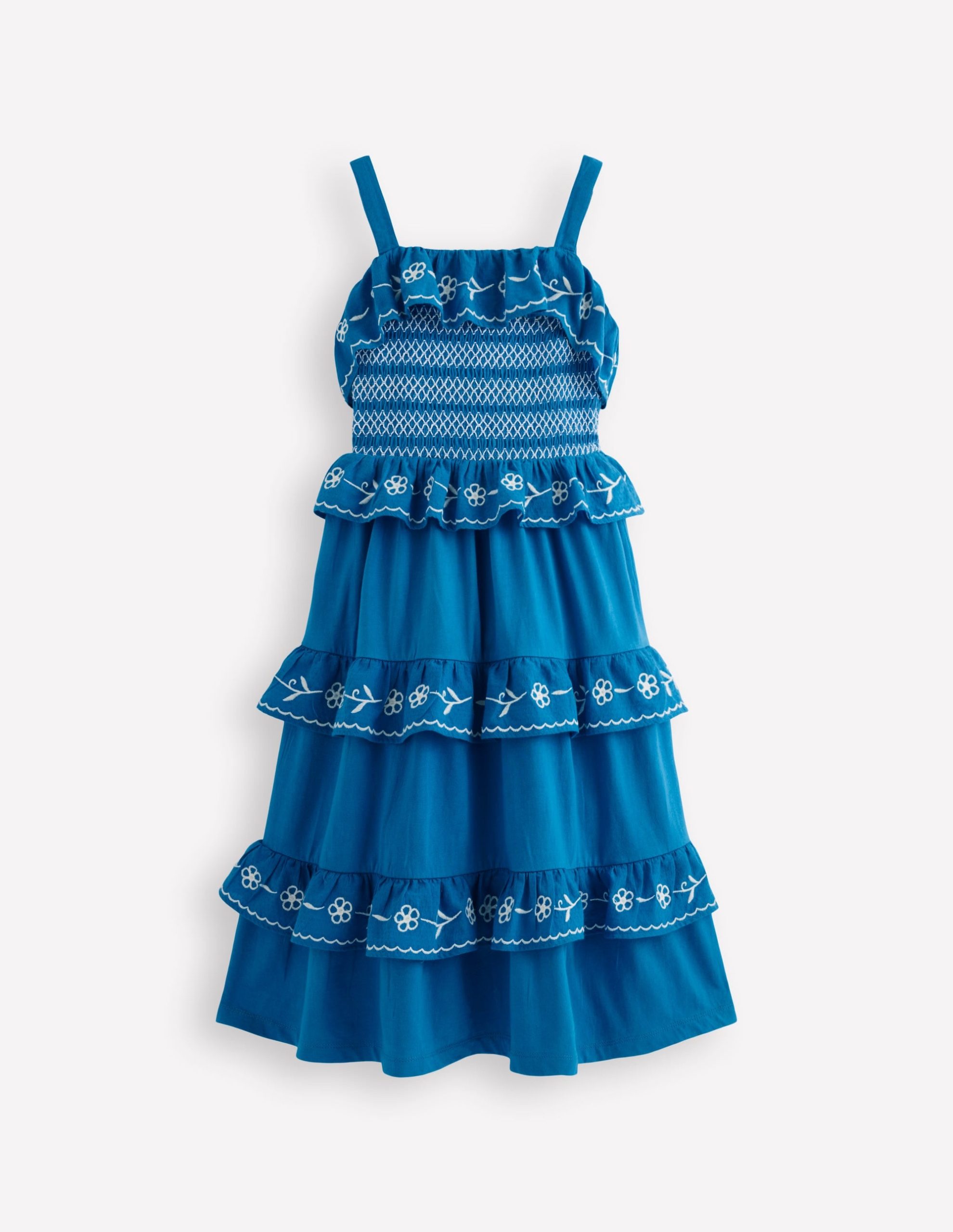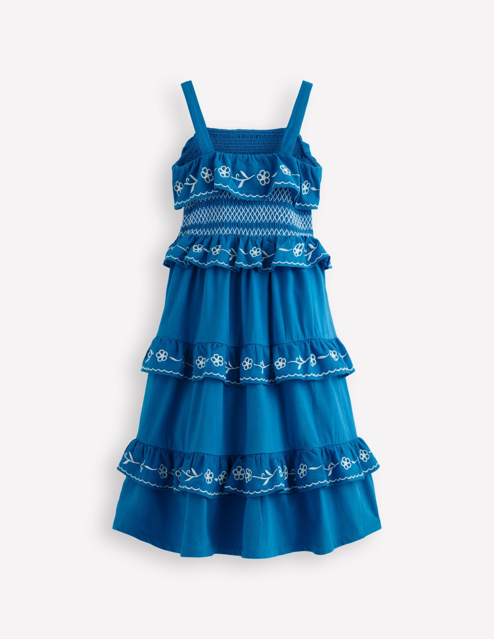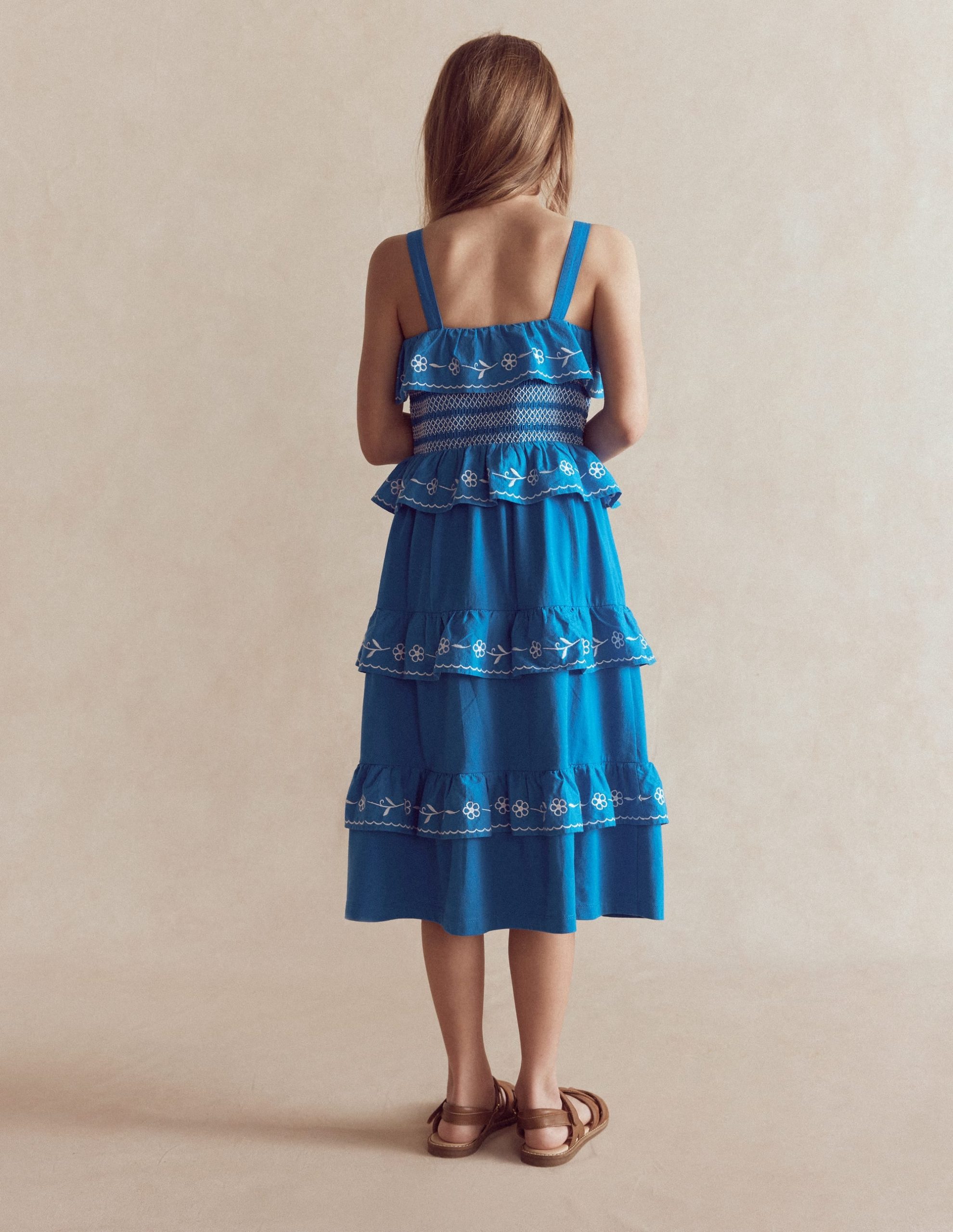 A midi dress that’ll make your Mini’s day. Spun from soft jersey cotton. the bodice is shirred for extra comfort and the tiers (we count six) will cause a kerfuffle: we’ve added embroidery and gathers to boost prettiness. volume and twirl-ability.