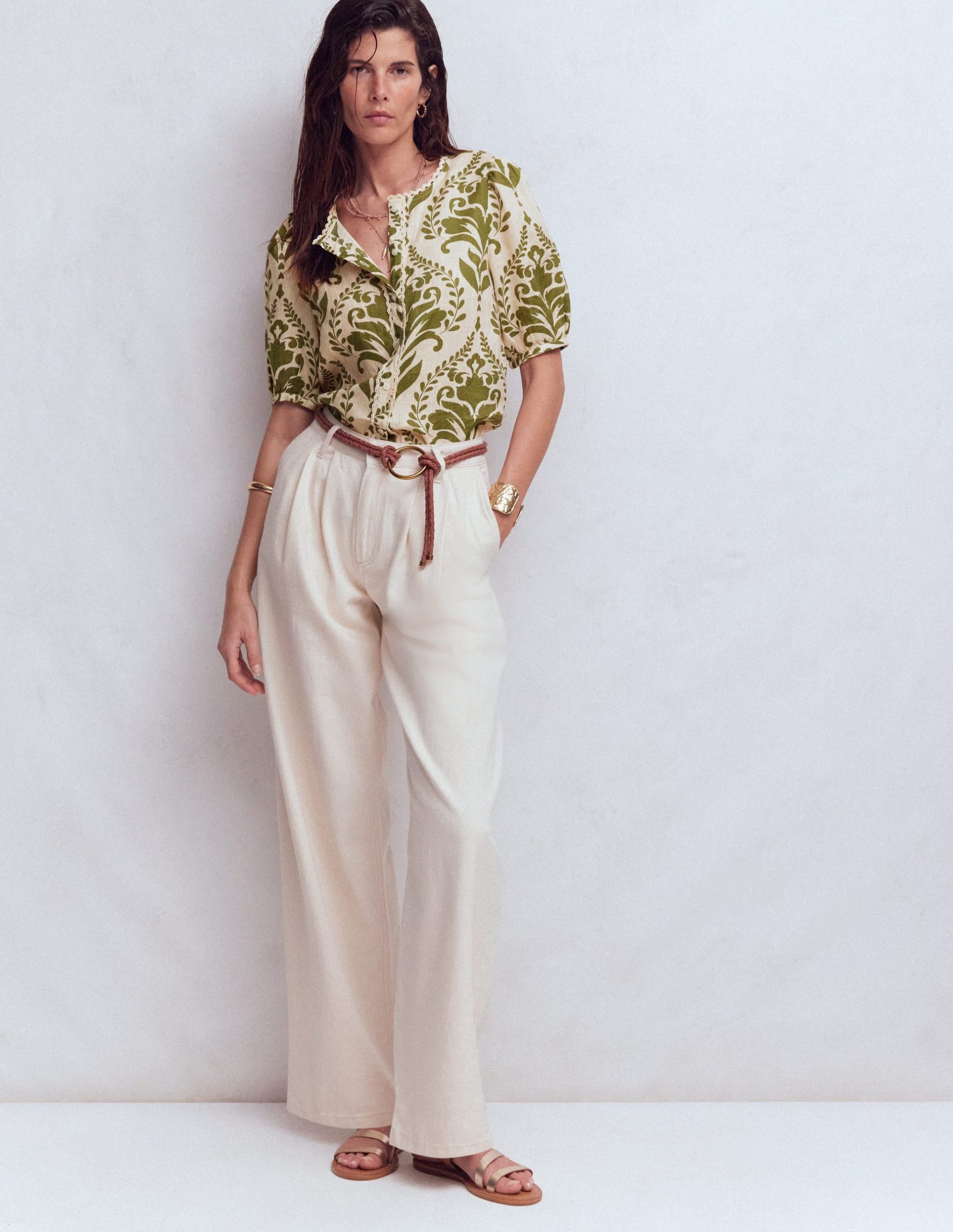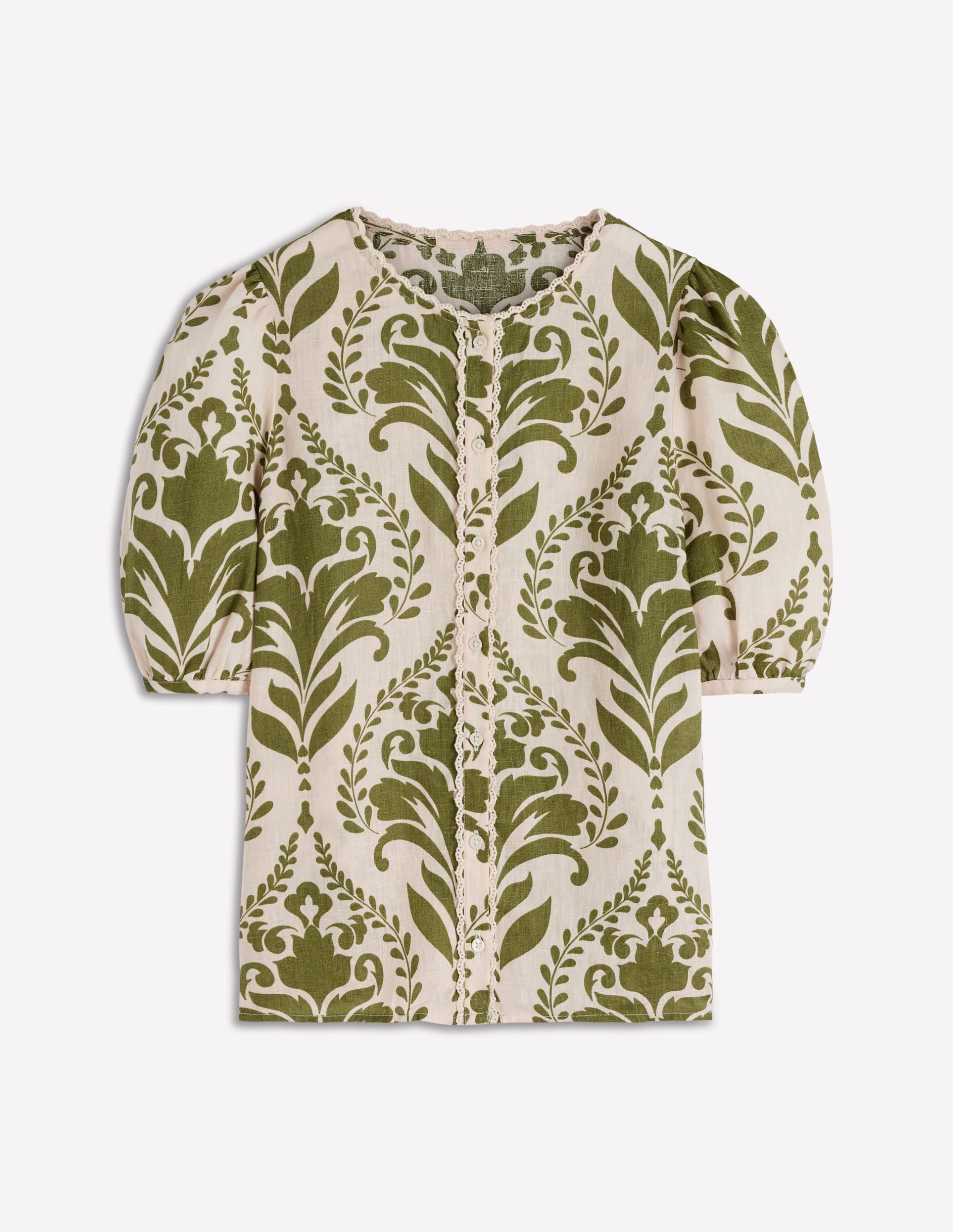 This pure linen top has us dreaming of warmer days. The romantic shape. short blouson sleeves and embroidered trim give it some special Boden finishing touches. Wear with jeans and a cardigan now. shorts and sandals later.