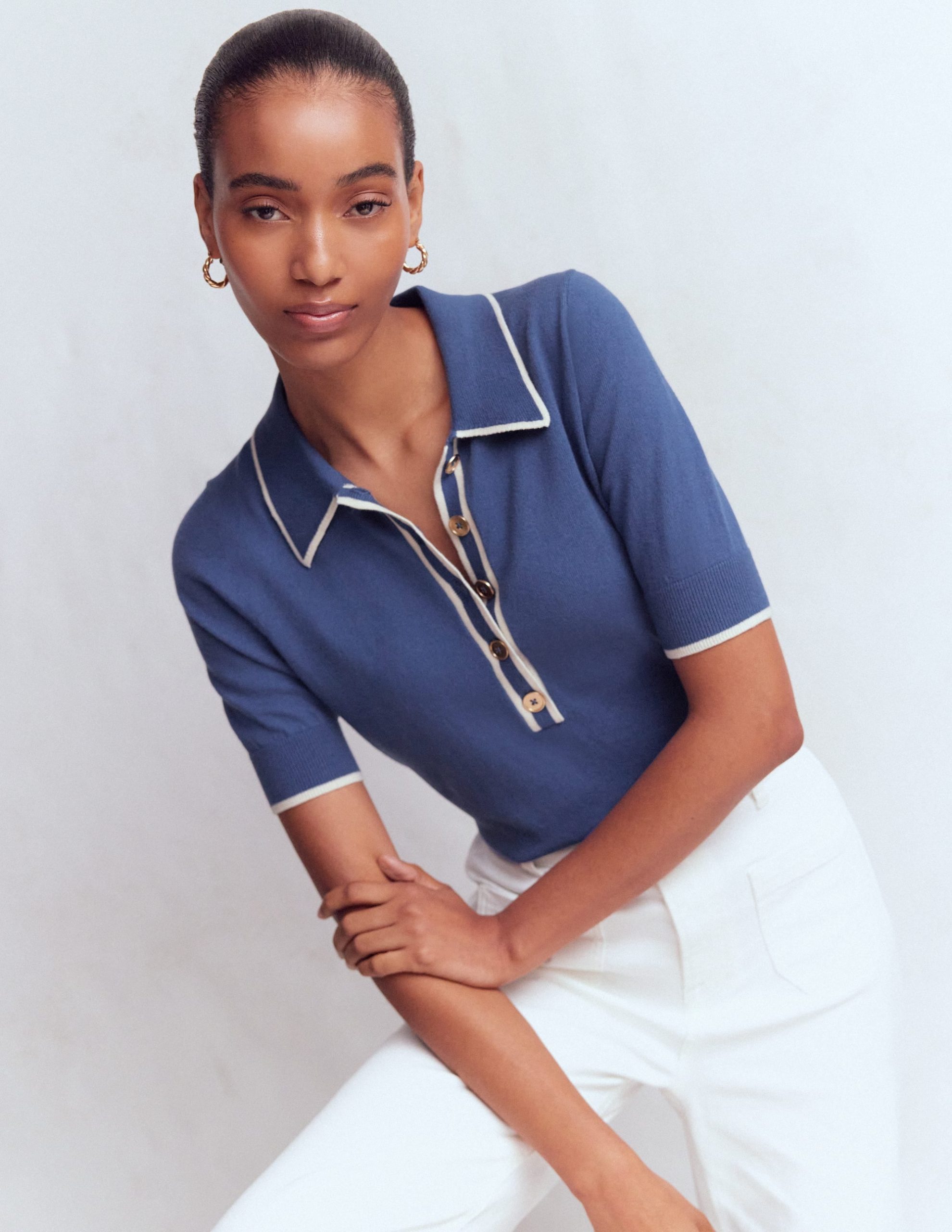 You love our Liz Henley jumper so much we reimagined it with short sleeves for warmer times. Crafted in a soft-yet-structured cotton and wool blend with elevated gold buttons it’ll draw in compliments everywhere you go this summer and beyond.