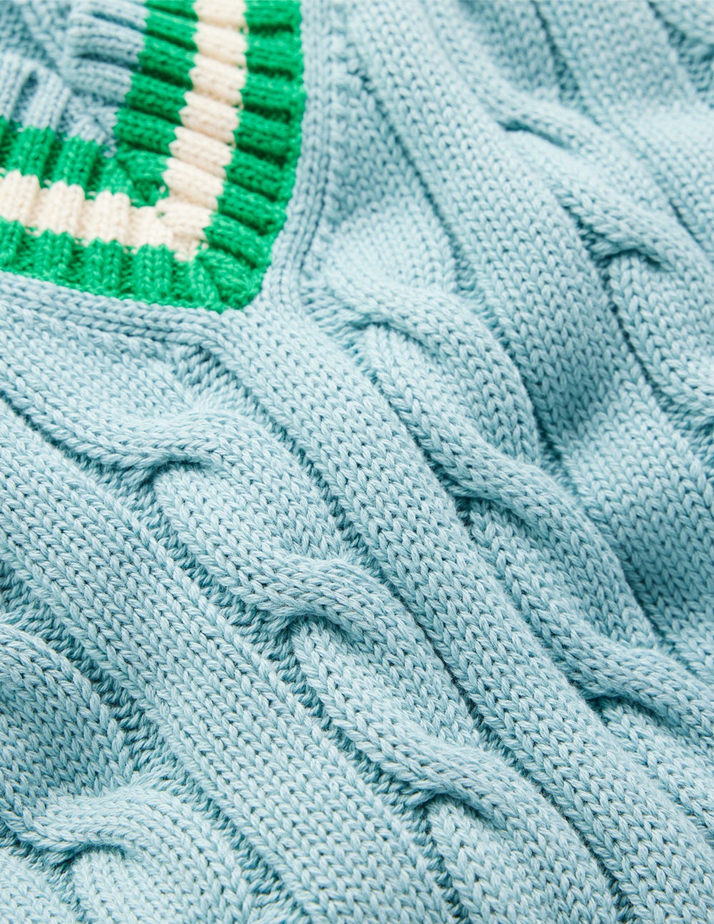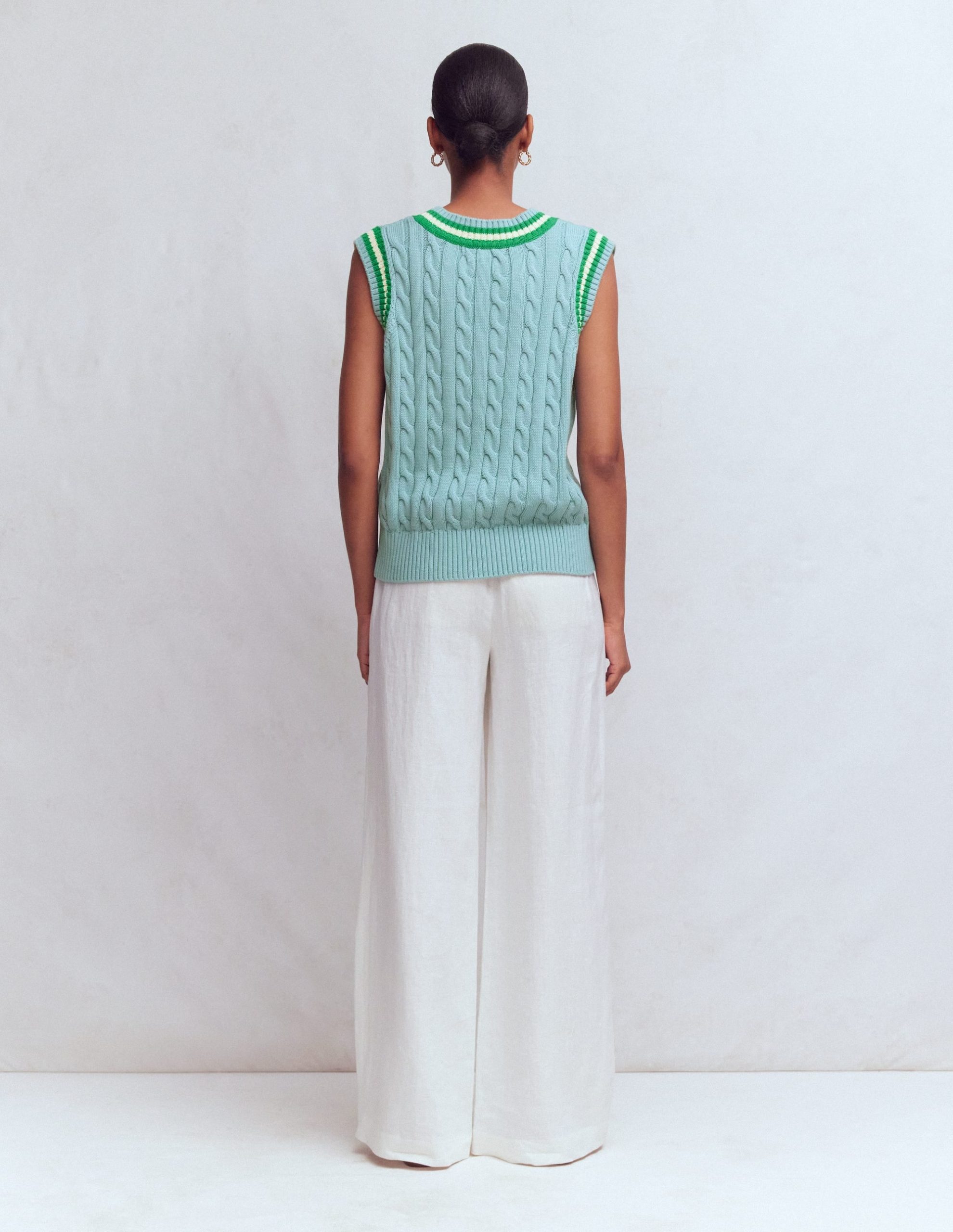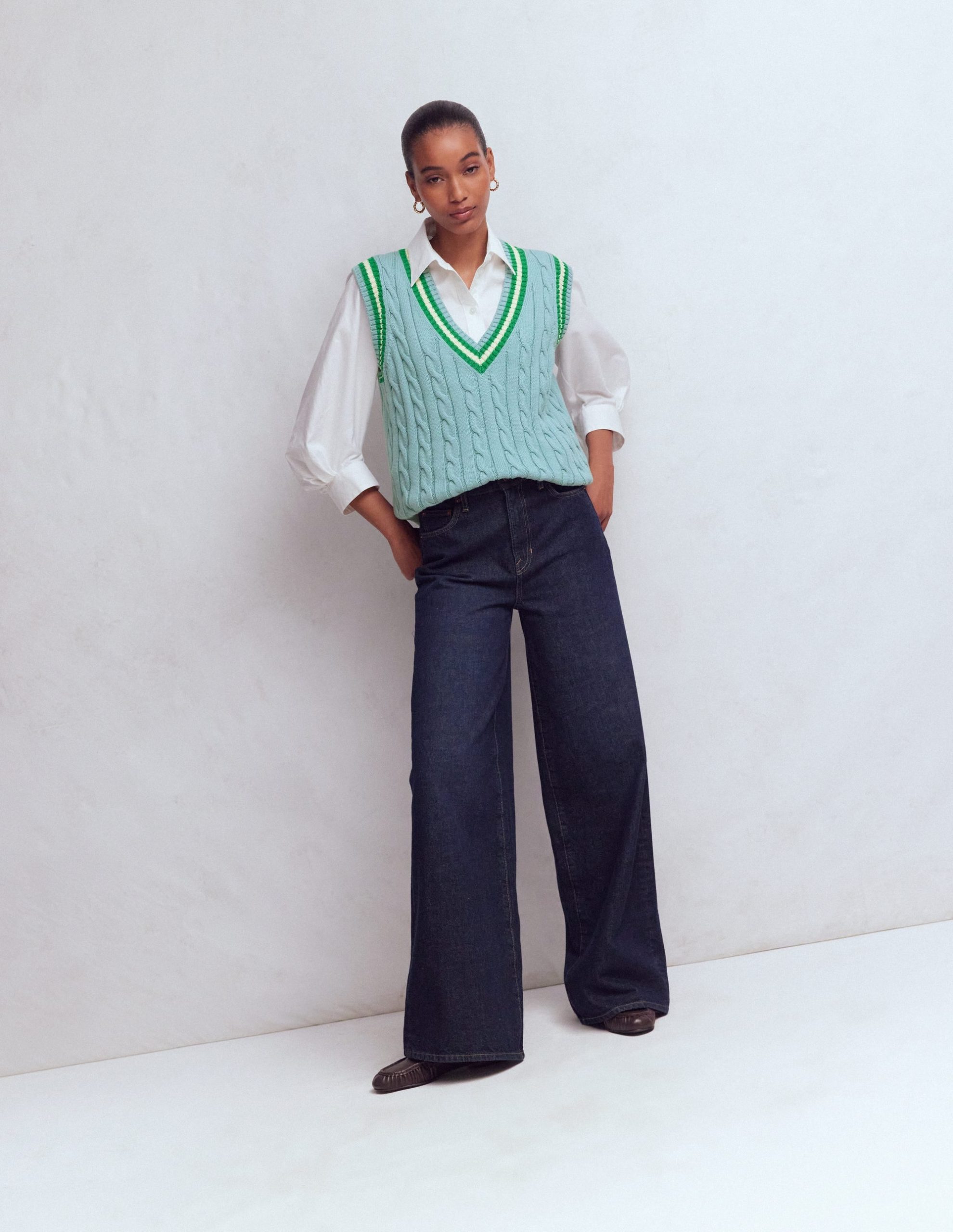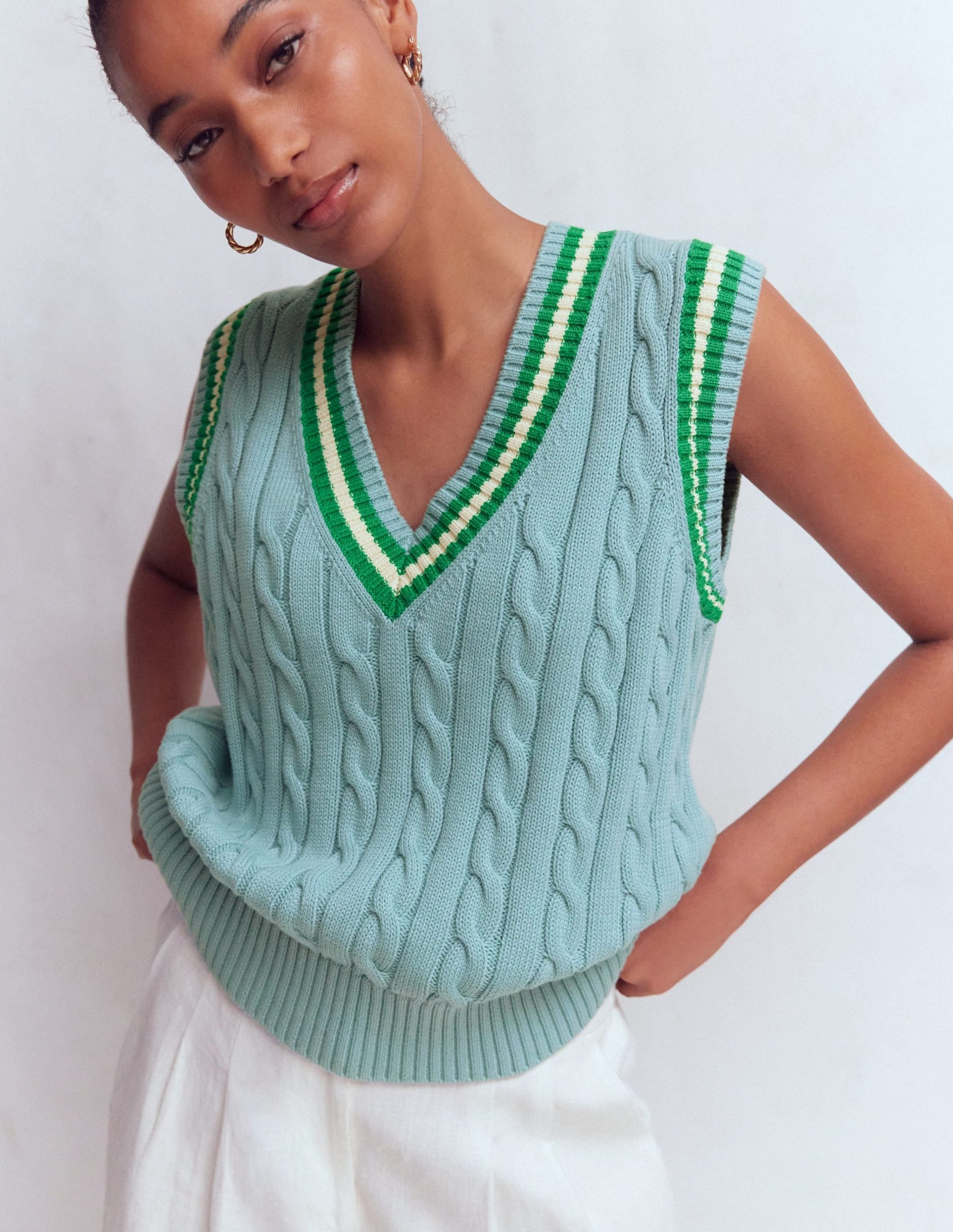 Meet Maeve: a lightweight V-neck cotton tank with a cable knit design. contrast colours and a fitted silhouette. The perfect preppy spring layer paired with jeans or linen trousers (we do both).