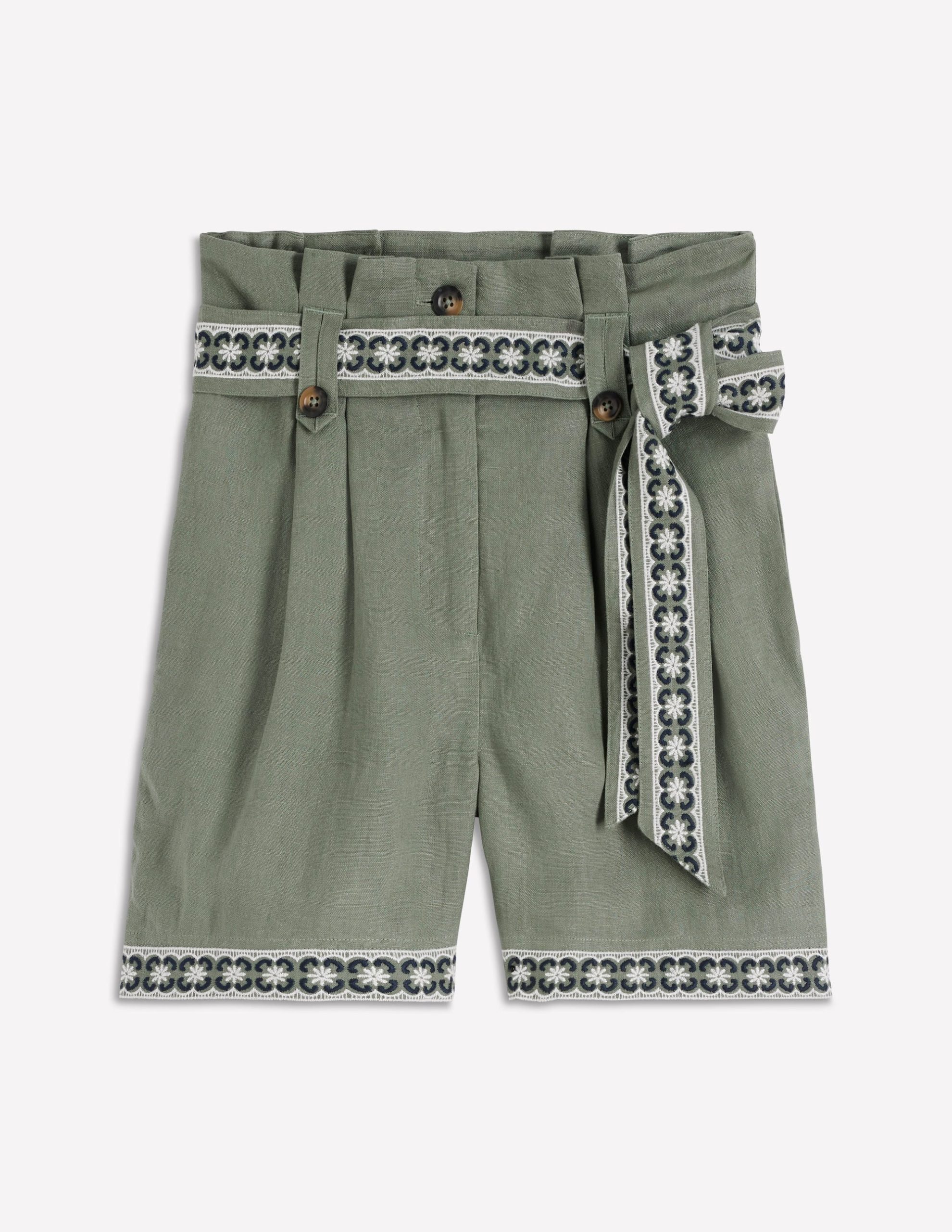 Paperbag Linen Belted Shorts-Agave Green Embroidery