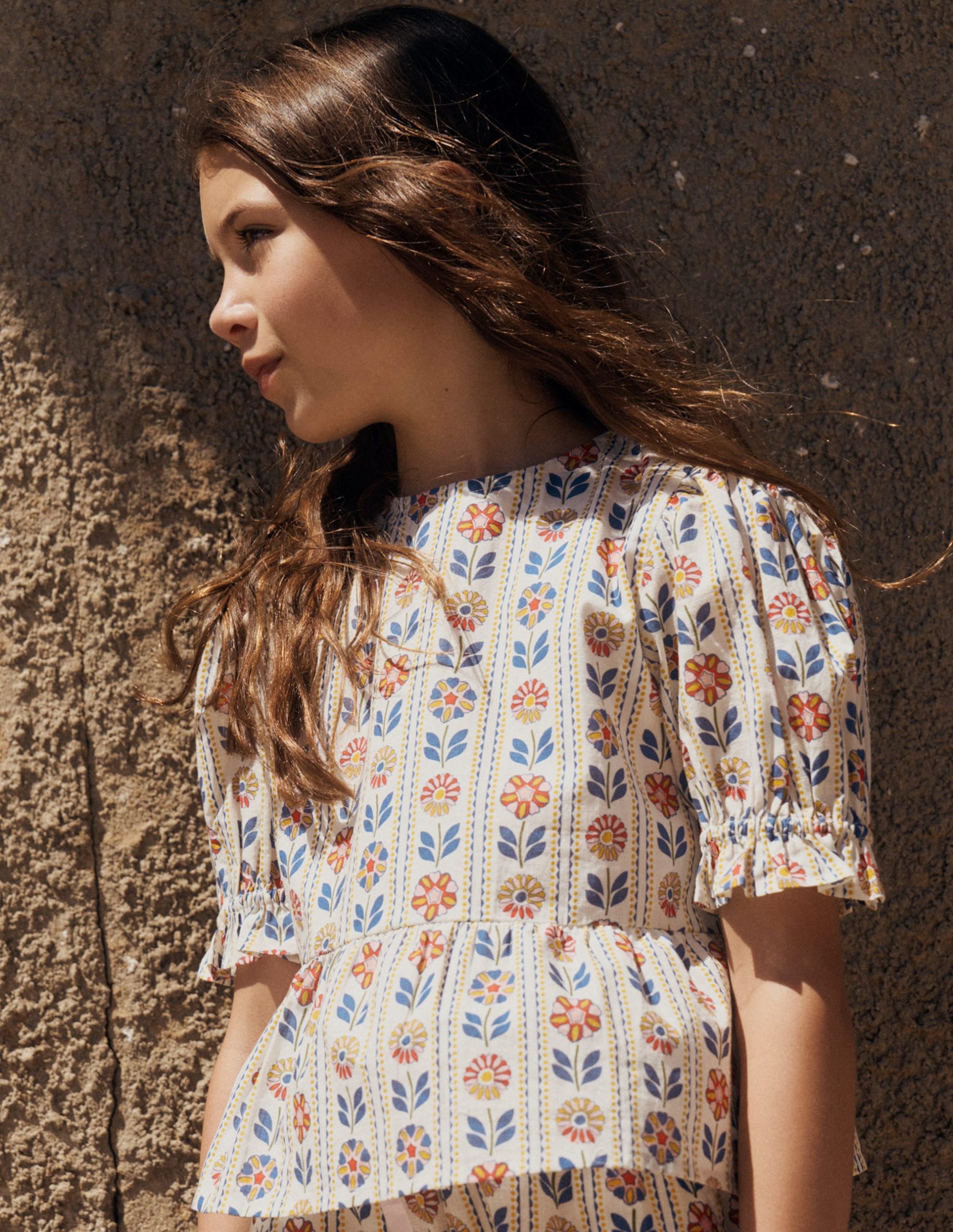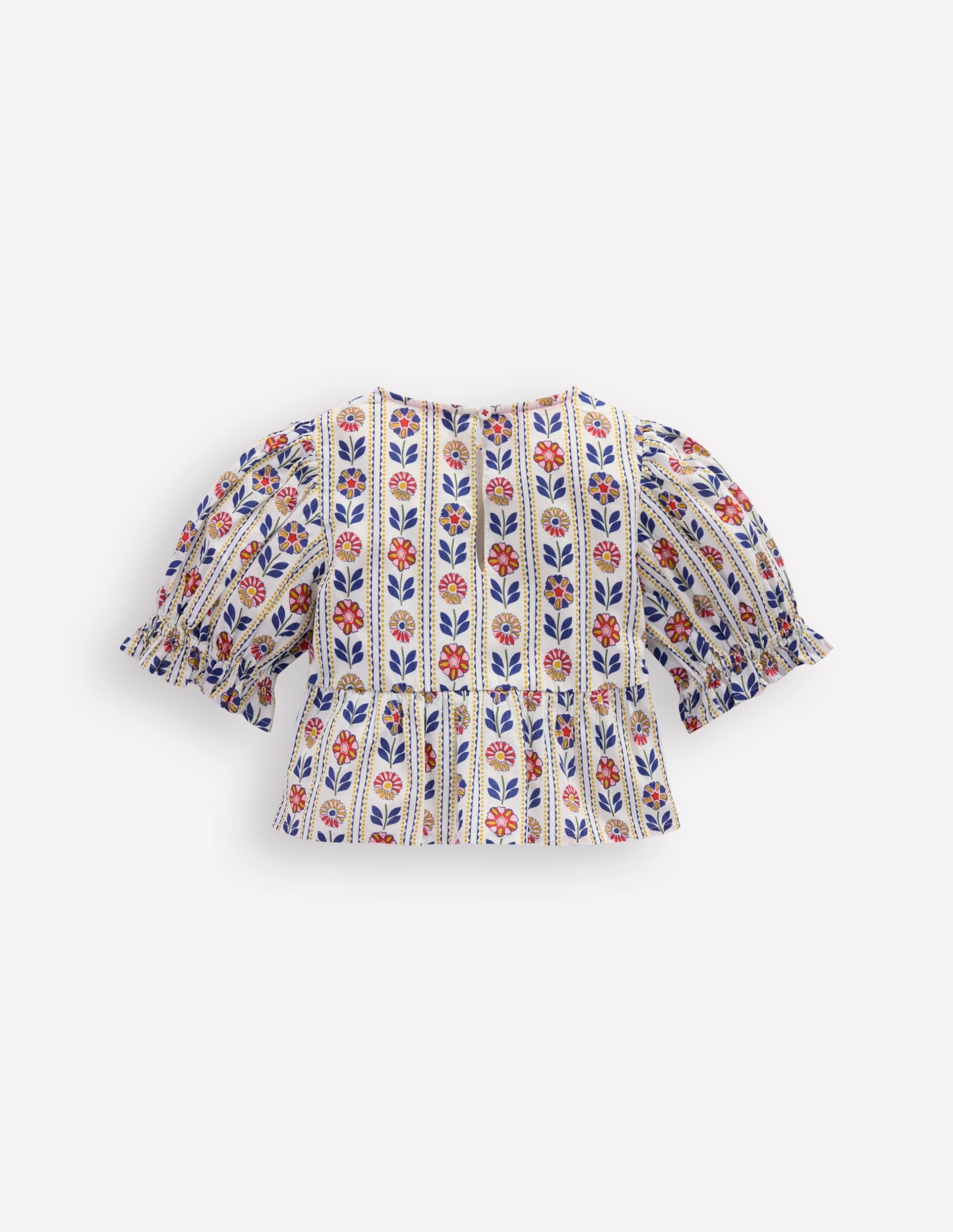 What is summer without ice-cream. sunshine and tops as floaty as clouds This woven cotton one is both light and pretty. It has puff sleeves. frills and a peplum hem. Choose from giant daisies. broderie and floral stripes and look out for the matching bottoms.