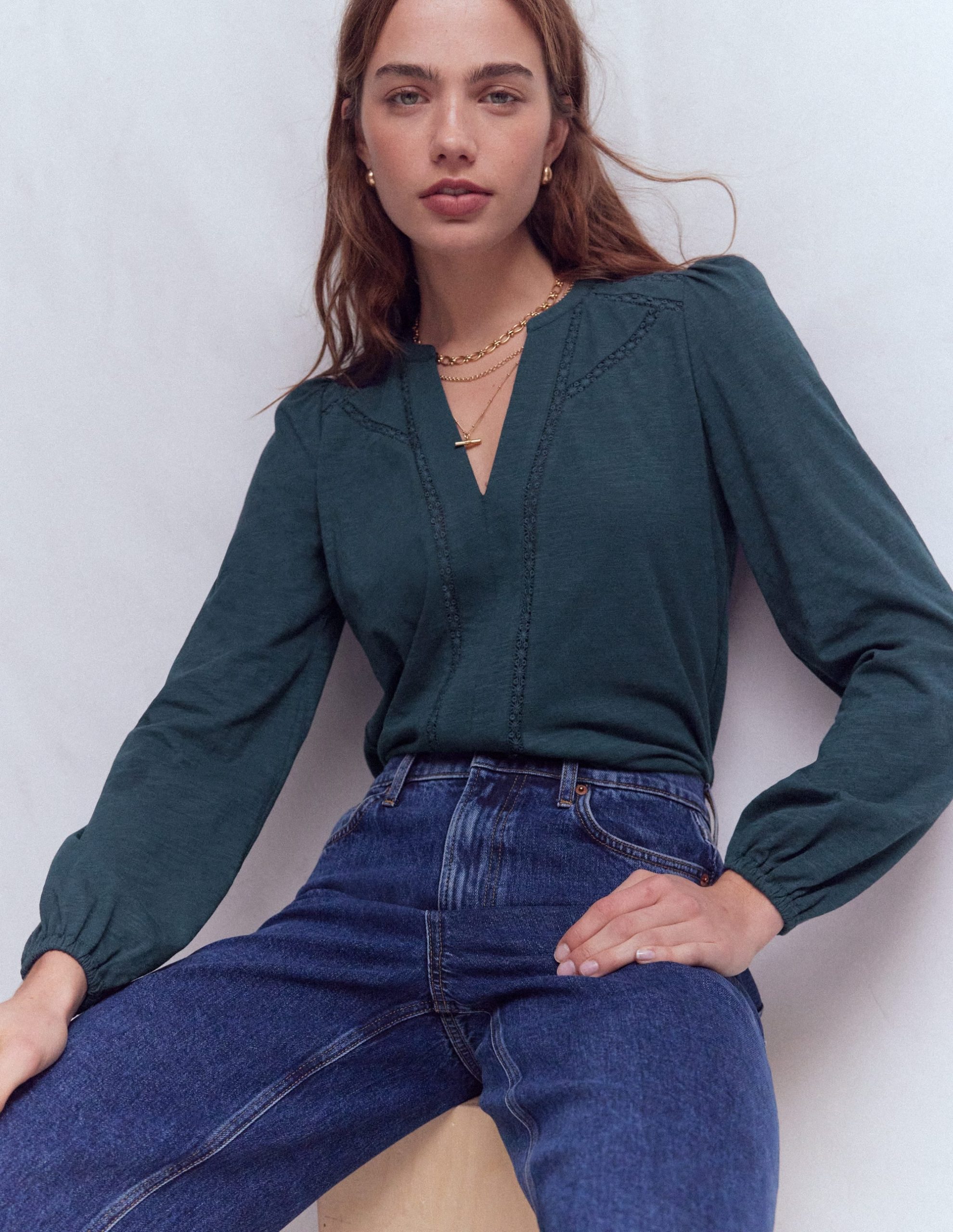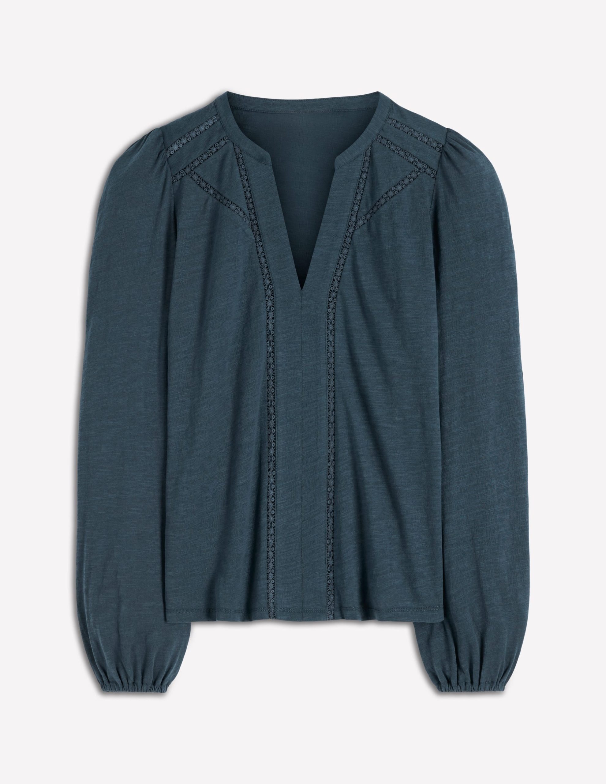The drapey everyday top your high waisted jeans have been waiting for. Simple lines, lace trim and soft jersey keep things effortless. Wear as a lightweight layer or push up the sleeves for a relaxed look.