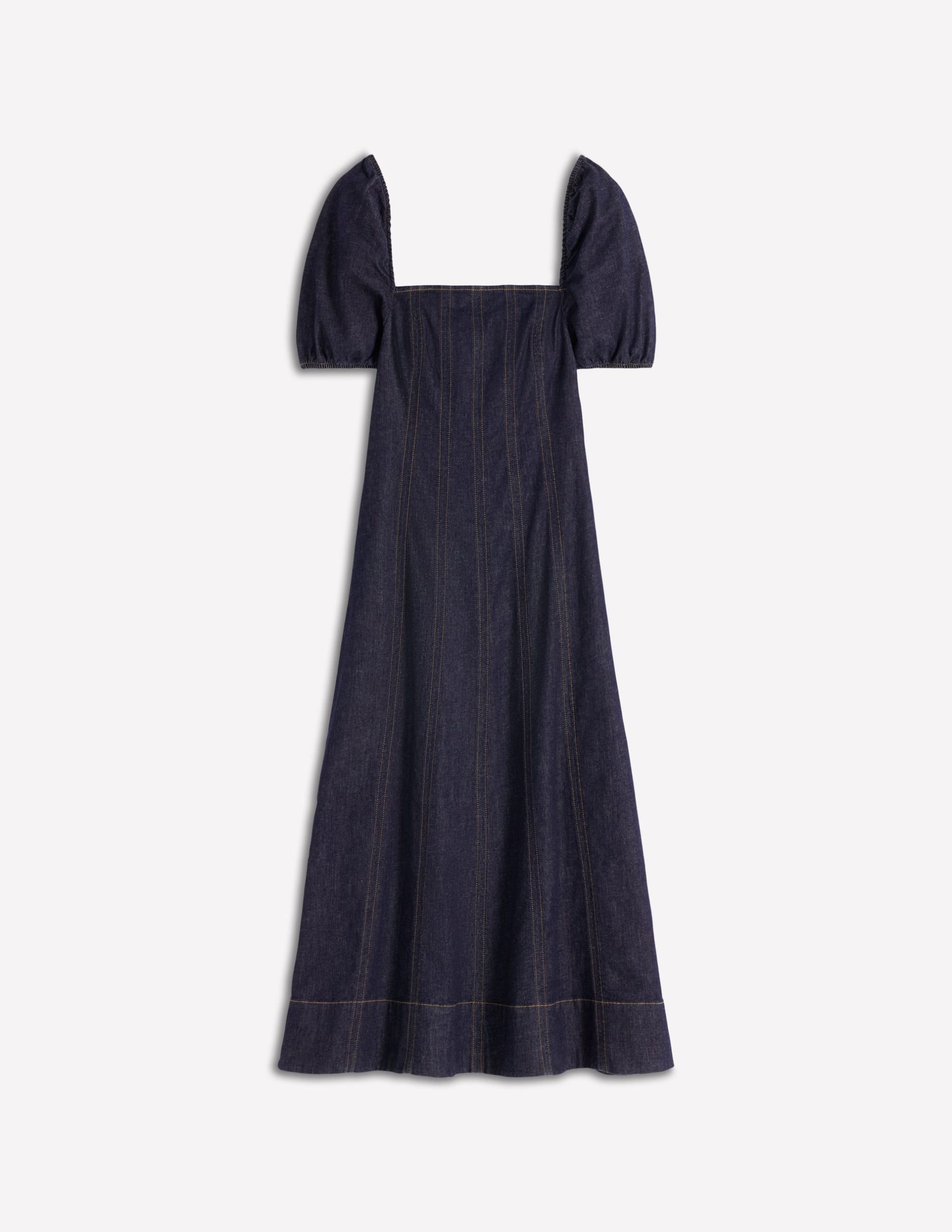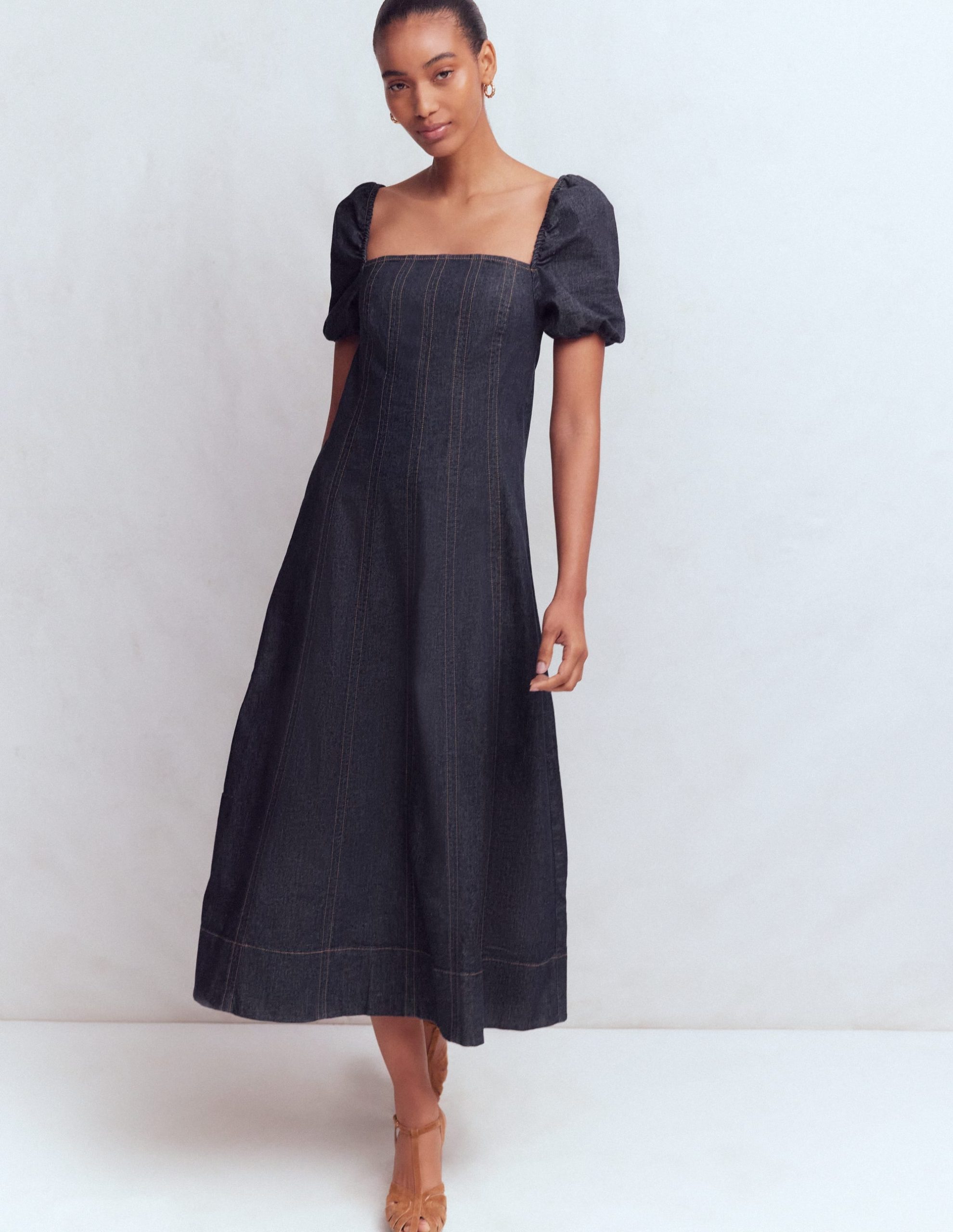 A structured denim dress with a feminine edge. This square neck style is crafted from cotton with a little elastane and features puff sleeves and flattering panels. Why not pull down the sleeves to create a bardot neckline and pair with high sandals.