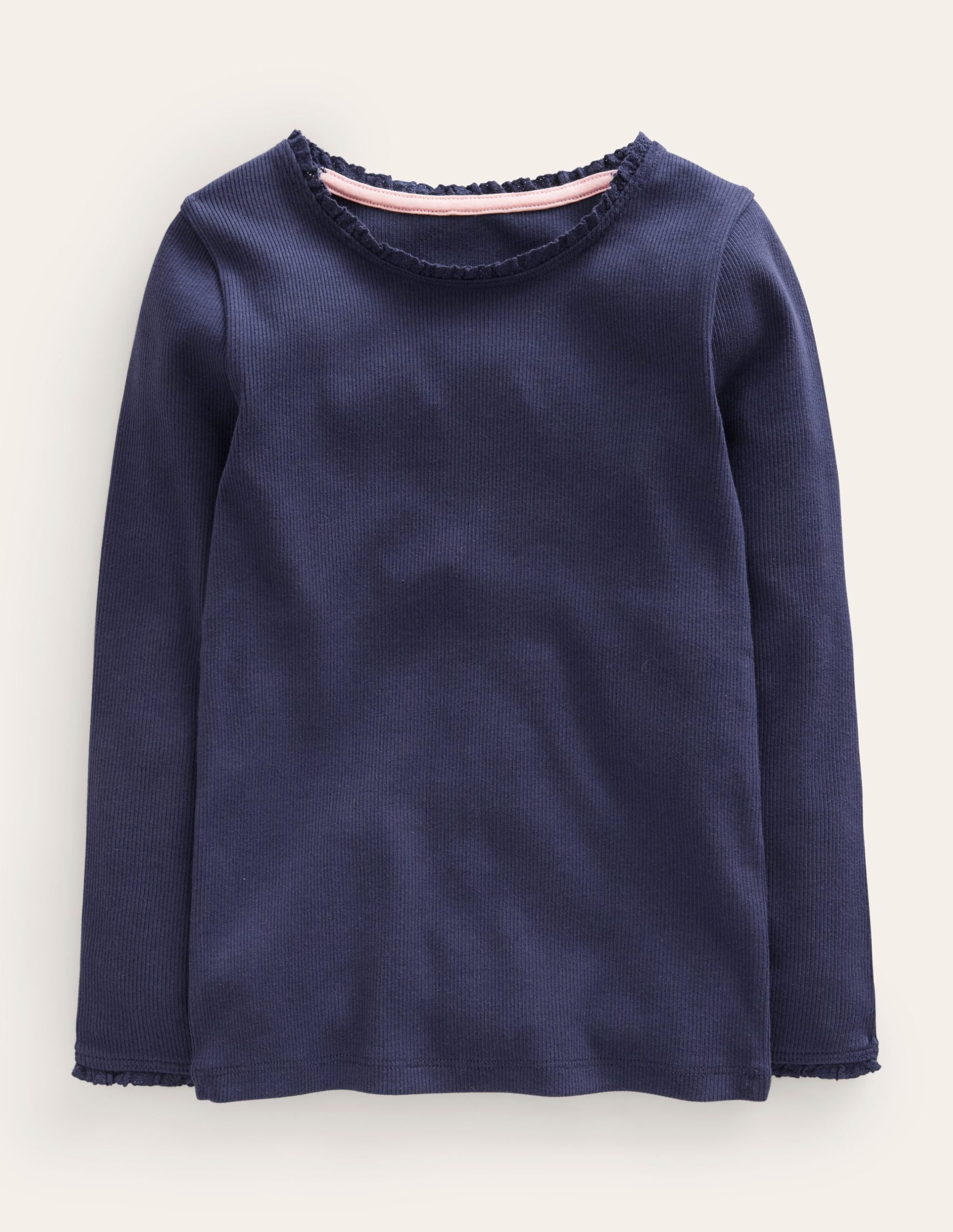 This sweet frilled-neck long-sleeve top is cut from ribbed-cotton for a snuggly fit that’s good layered or worn on its own.