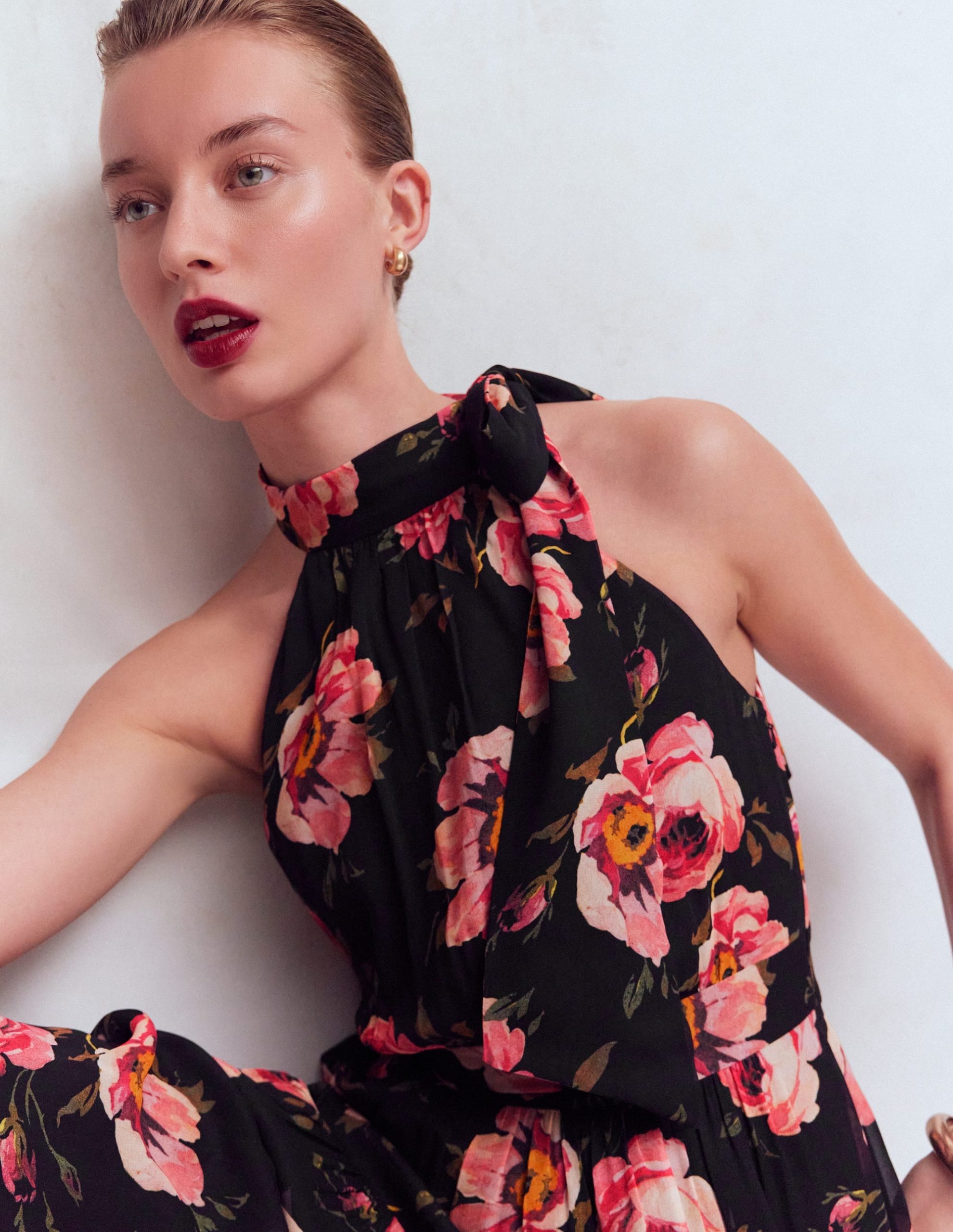 This dark floral print shoulder-bearing dress is perfect for all your occasions from weddings to summer soir??es and adds just the right amount of drama. Crafted from soft drapey fabric. we’ve given it structure with the tie-front halter neck. defined waistband and pleated skirt.