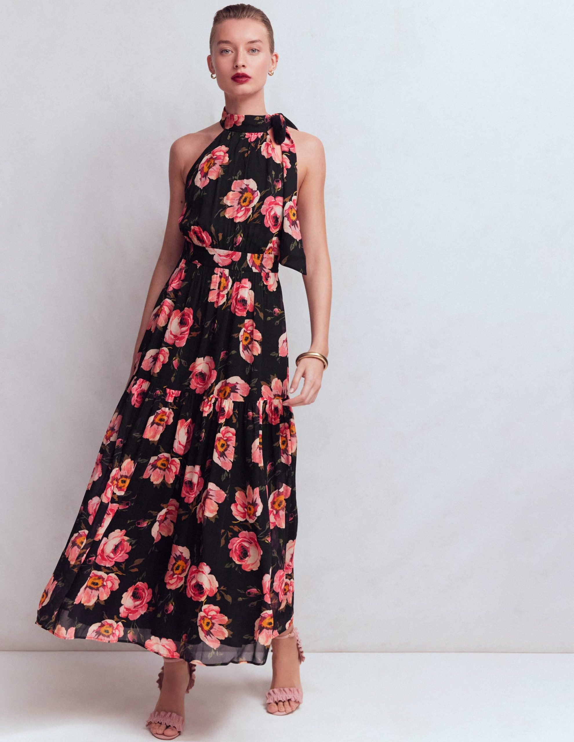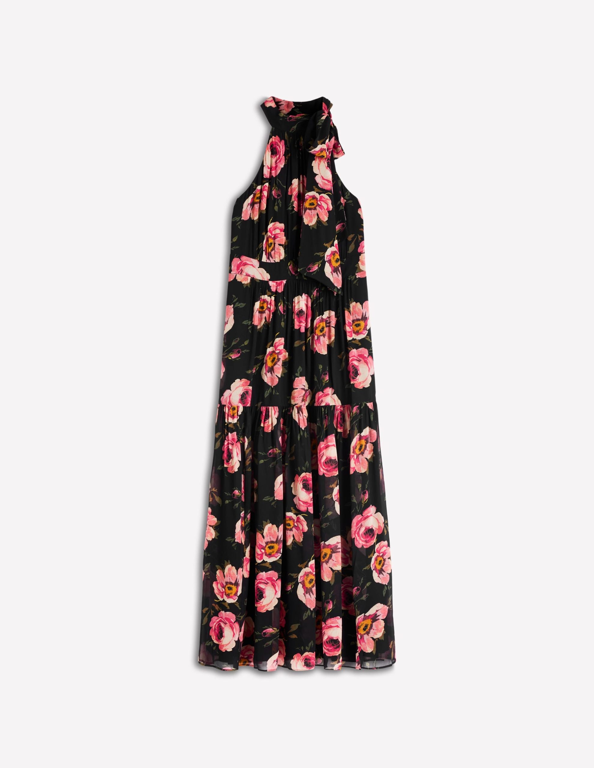 Roisin Tie Neck Maxi Dress-Black Whimsical Roses