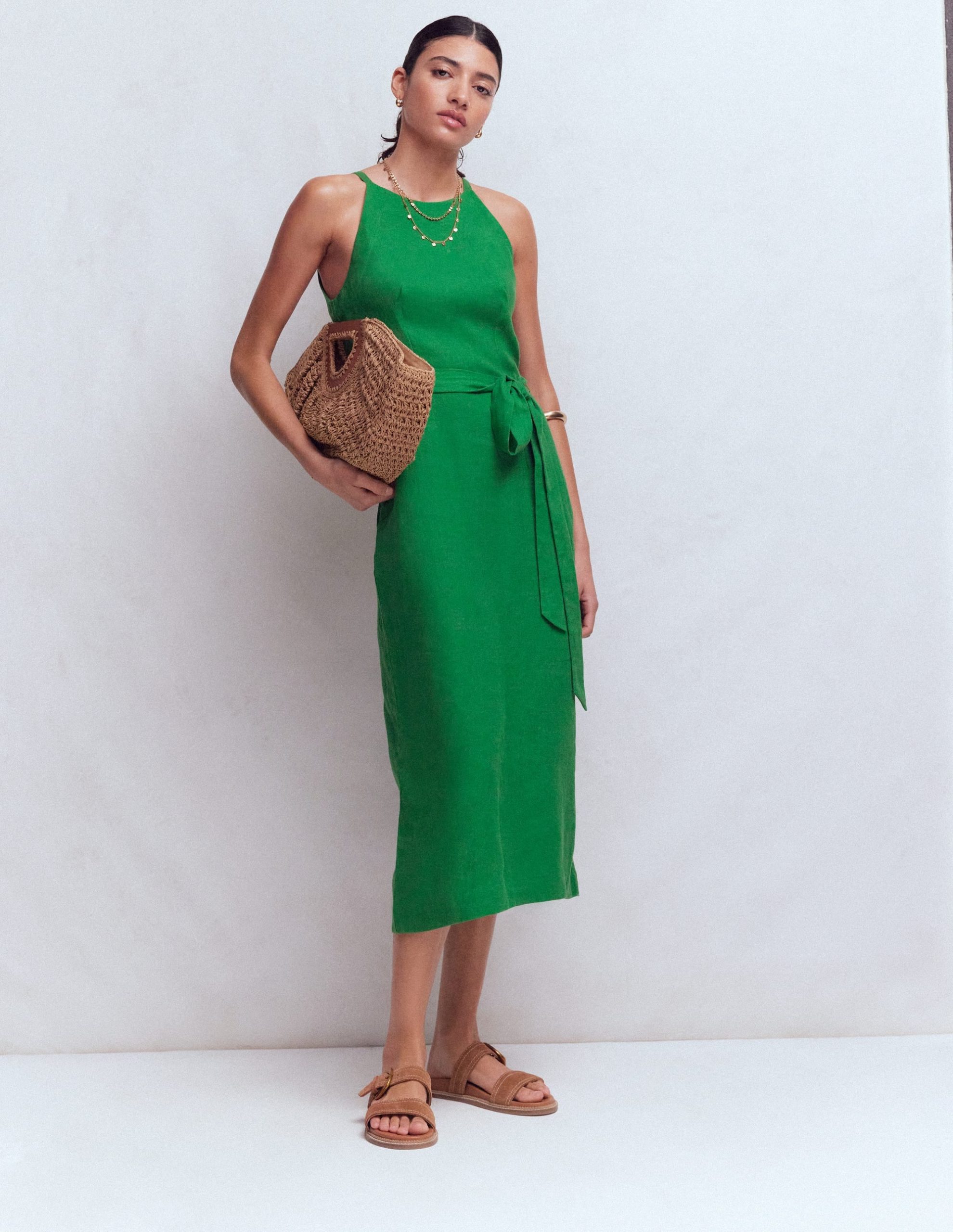 Breathable linen and a halter neck give this midi dress a fresh feel for the warmer months ahead. Choose from grounded neutral shades and bright block colours.