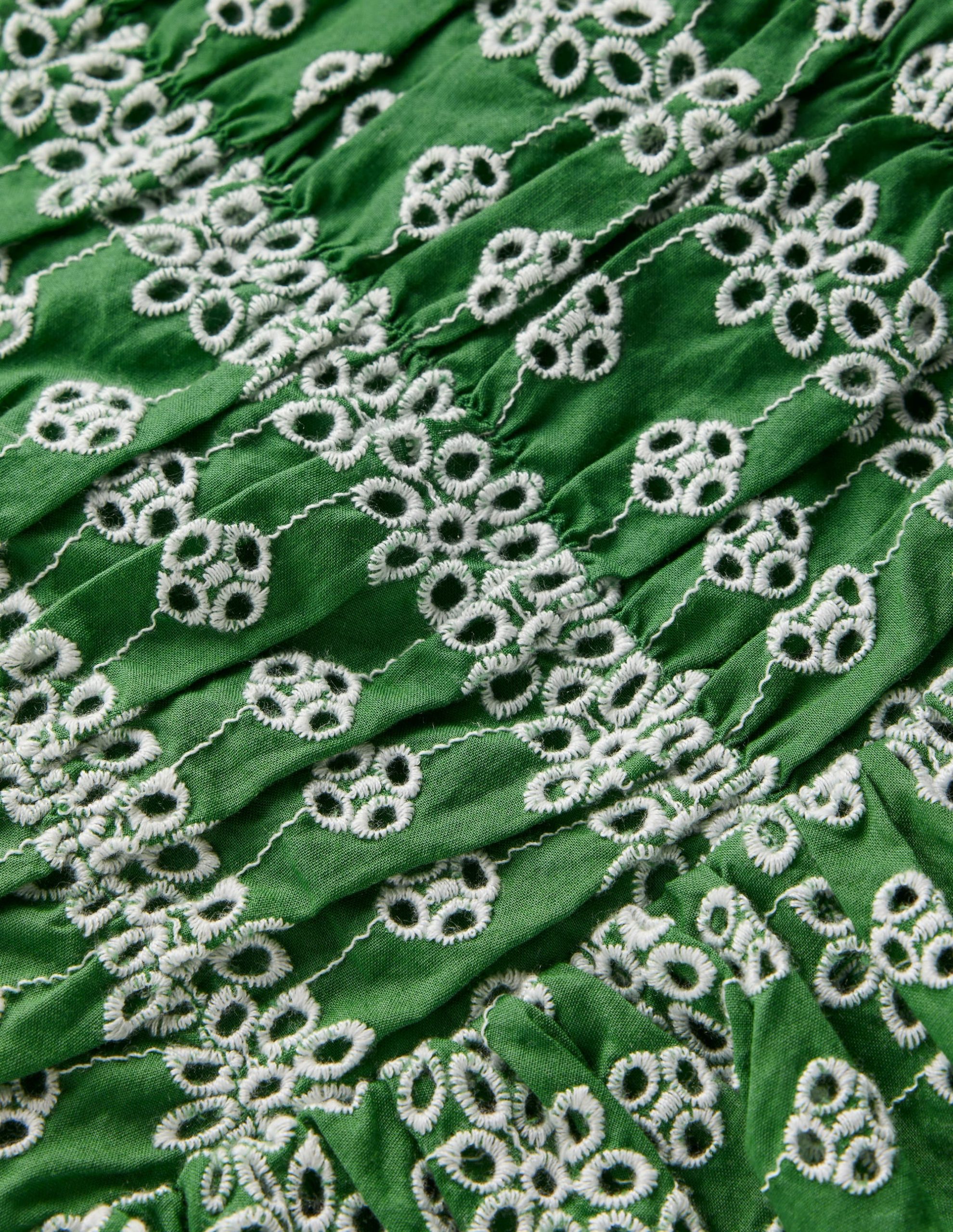 Minis love to blow bubbles. We designed a delightful dress so they can wear one too. The bodice is ruched with bow straps that cross at the back. Soft gathers create a skirt with lots of fun volume. As for the prints Try stripes. broderie and flowers.