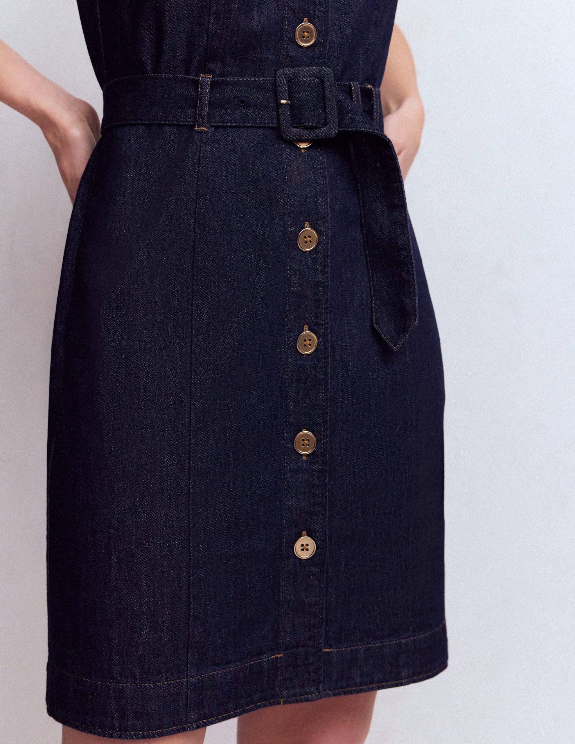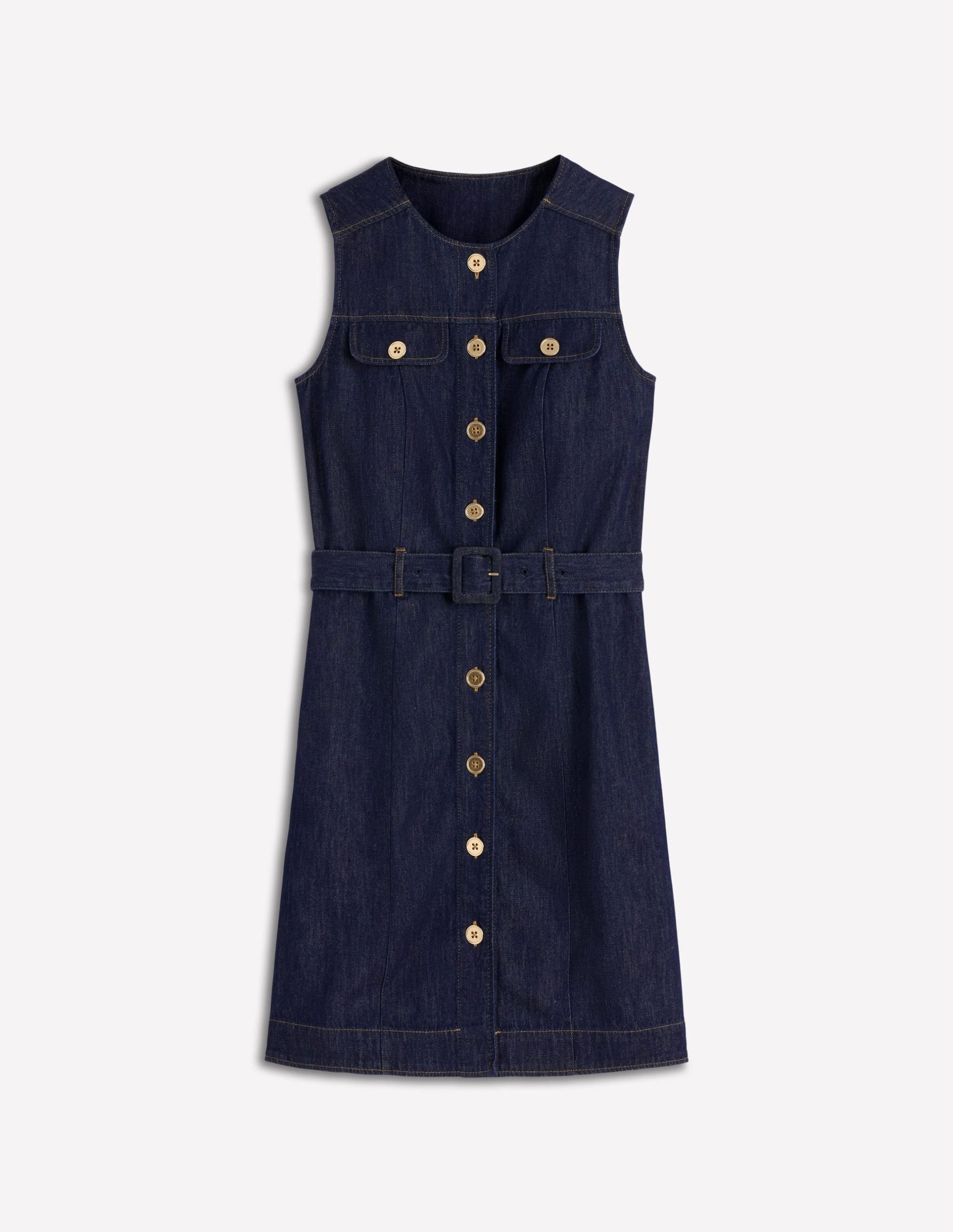 A timeless short denim dress that will look great layered with a shirt or waron alone with sandals in warmer weather. It features a 60s-inspired shift silhouette. gold-look buttons and a buckled belt.