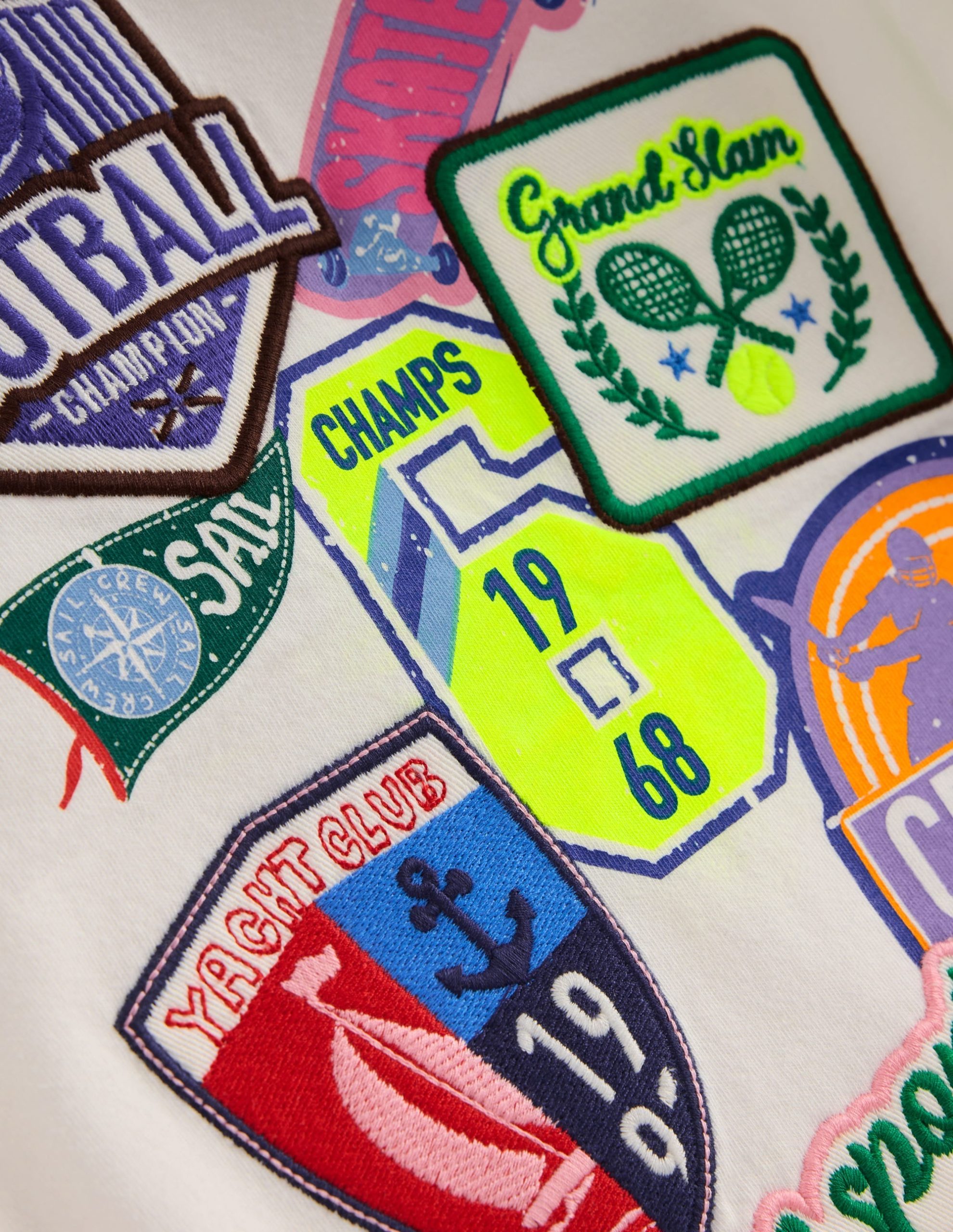 With its cool patches. this soft cotton T-shirt has all the fun of collecting badges ?C without any sewing for the grown-ups.