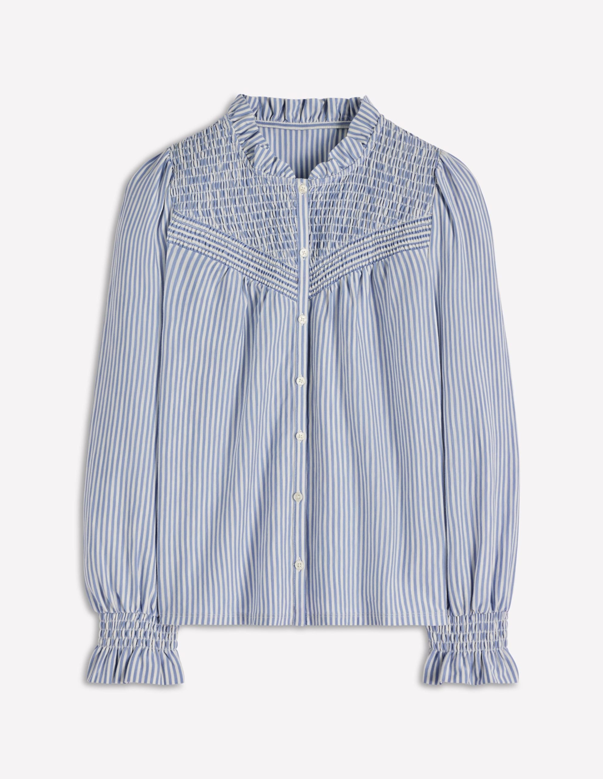 The cotton jersey fabric and front panel smocking give this charming Victoriana-style comfort and depth of detail. The soft volume sleeves (easy to push up) and pie crust collar will shine alone or under our merino cable knit tank. What colours will you choose?