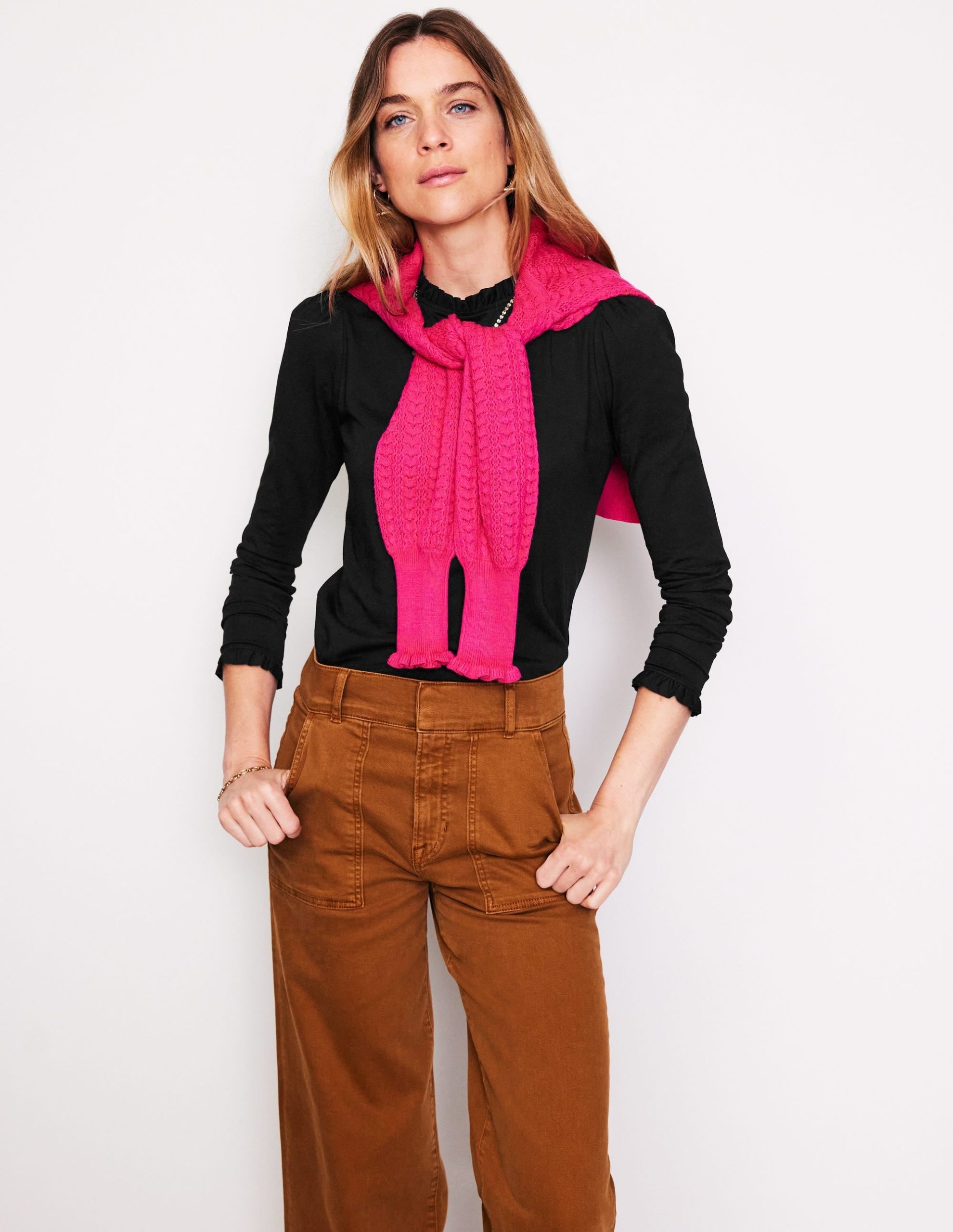 For when you’d rather be in pyjamas, but can’t really skip that presentation. Our supersoft frill detail top is a joyful kind of a compromise. It works marvelously alone or as a base layer.