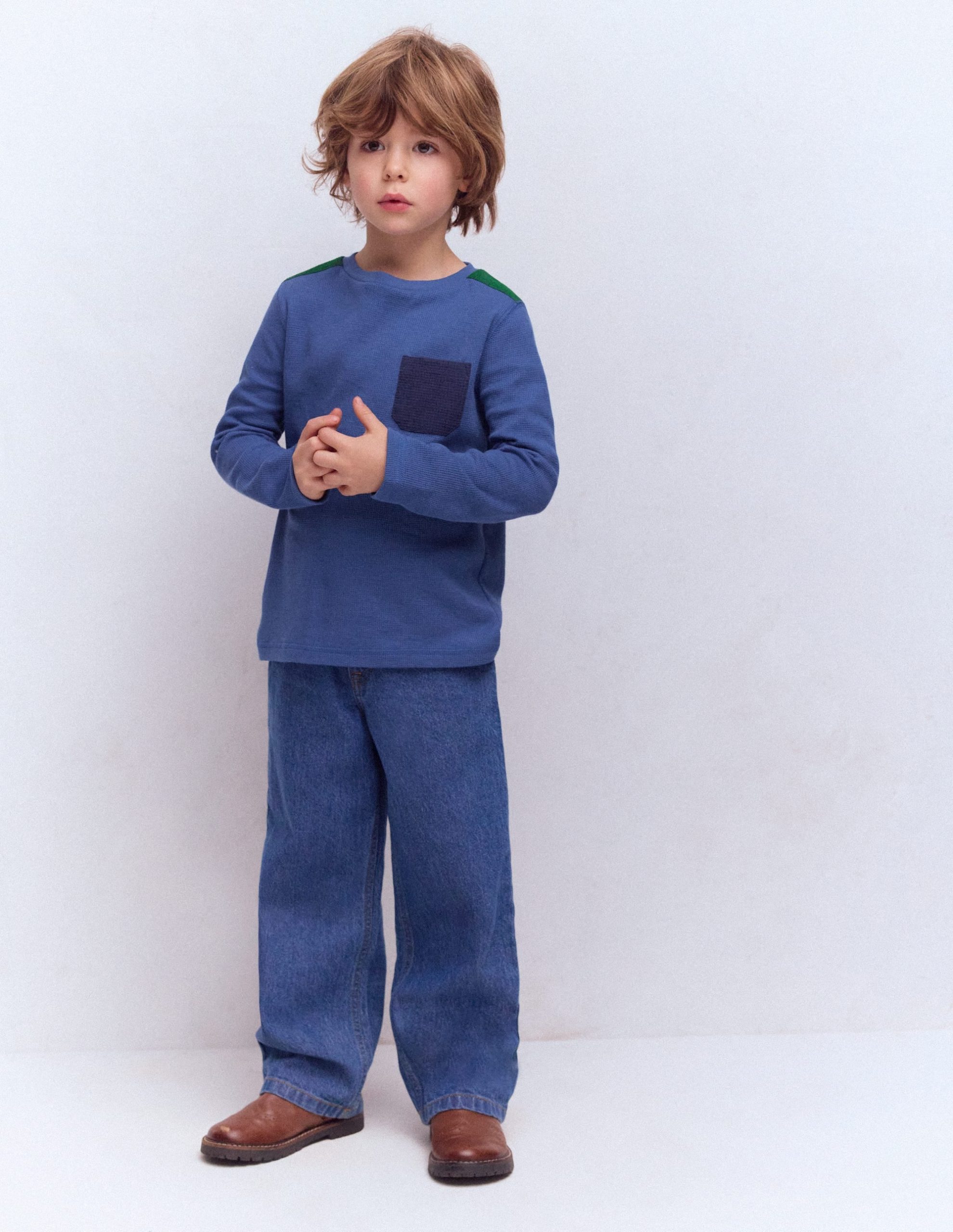 Cosier than your average T-shirt, this one is made with a soft waffle cotton. We’ve finished it with playful colourblocking, including a contrasting patch pocket.